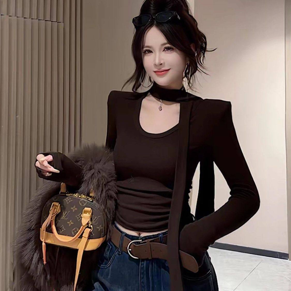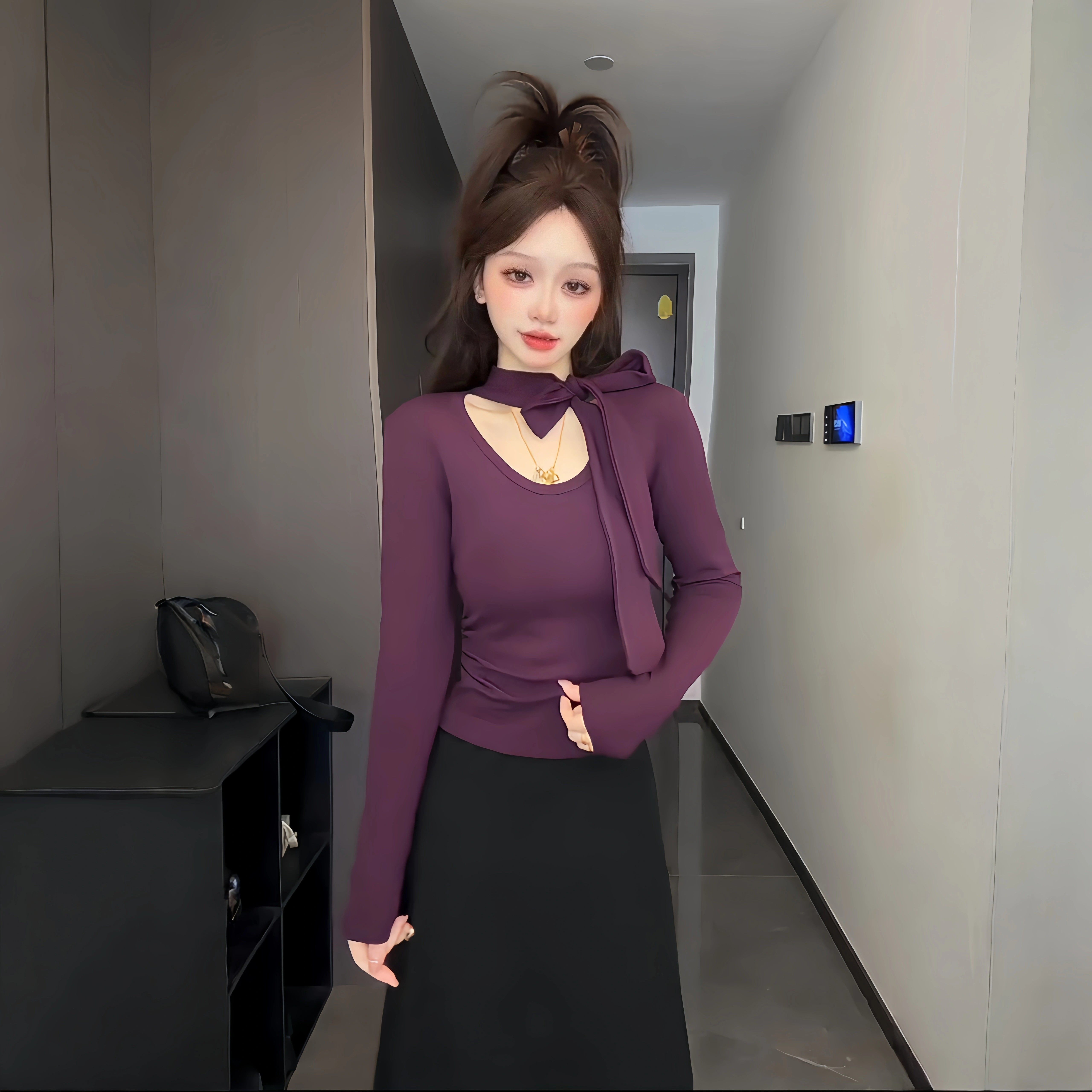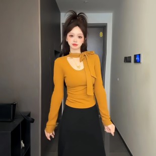 显瘦打底衫 韩式 T恤女早秋修身 小众设计感飘带V领长袖 百搭上衣 新款