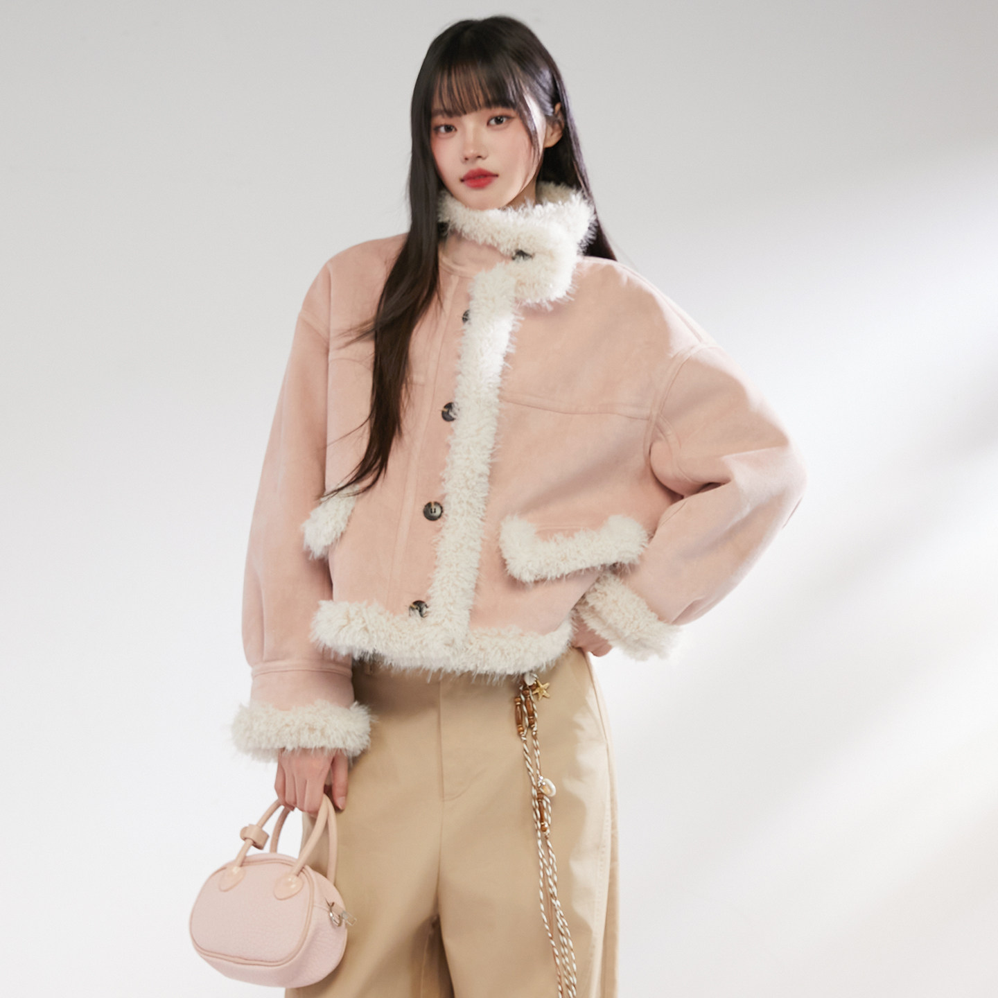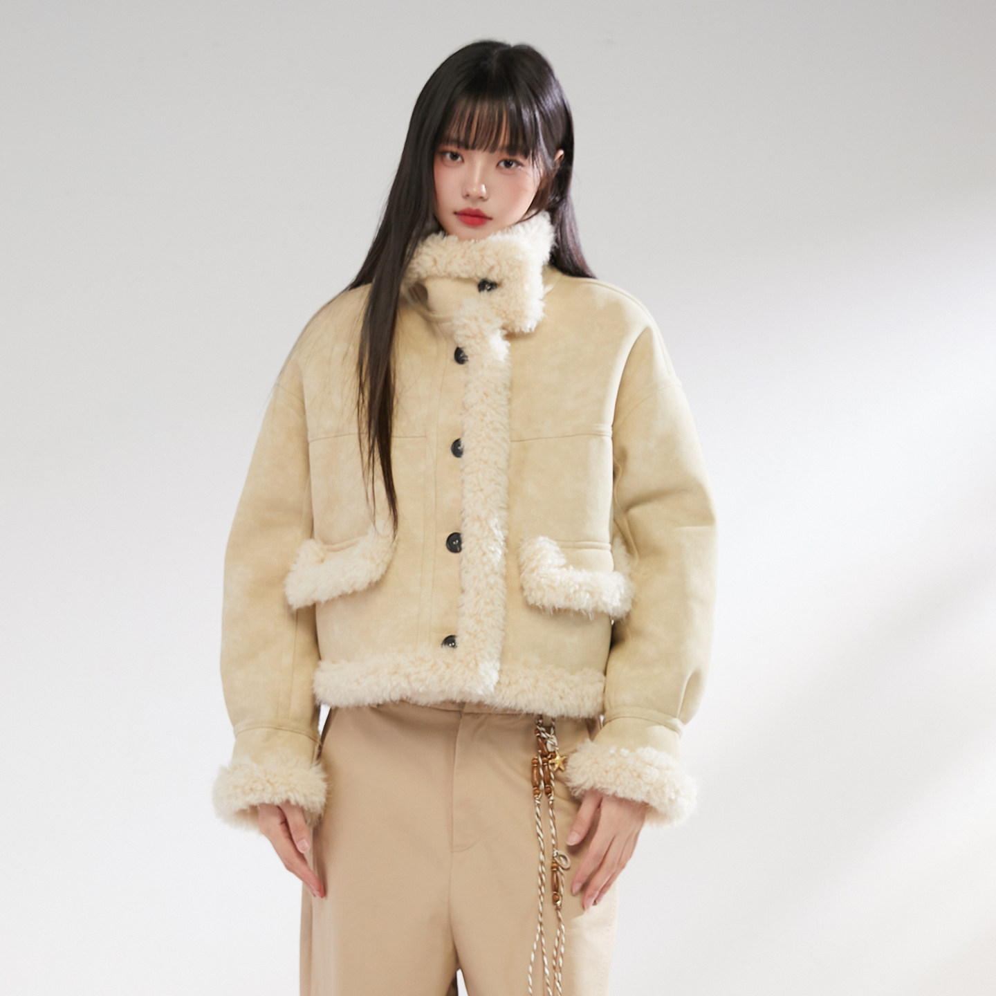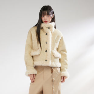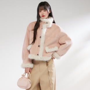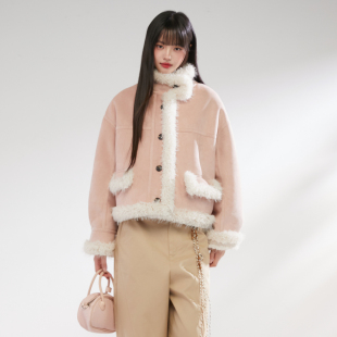 加厚皮毛一体上衣女 短款 King Prince麂皮拼接羊羔毛外套女冬季