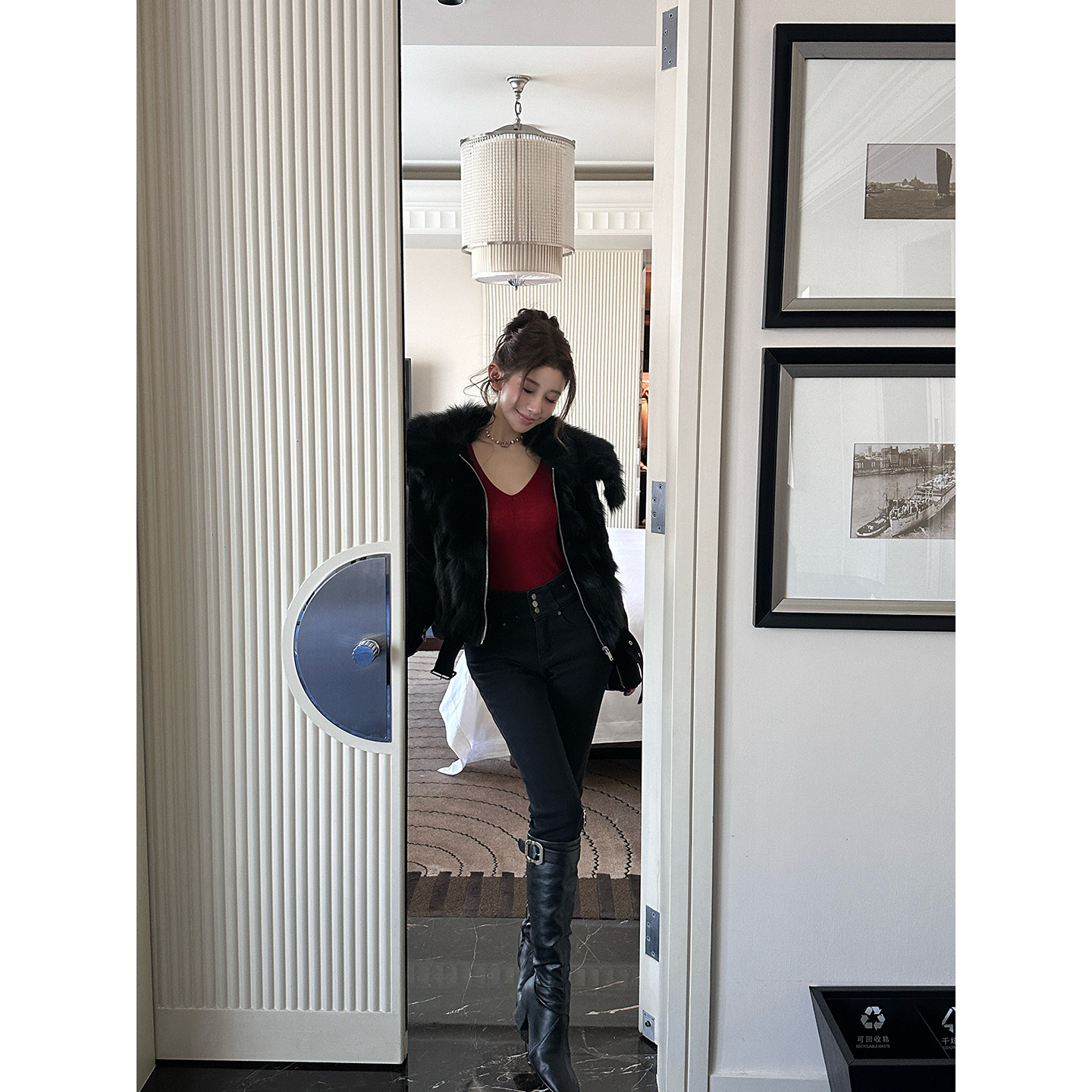 女冬小个子高腰加绒加厚直筒裤 百家好黑色九分牛仔裤 House Basic