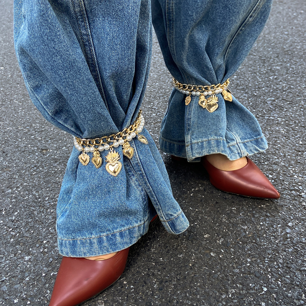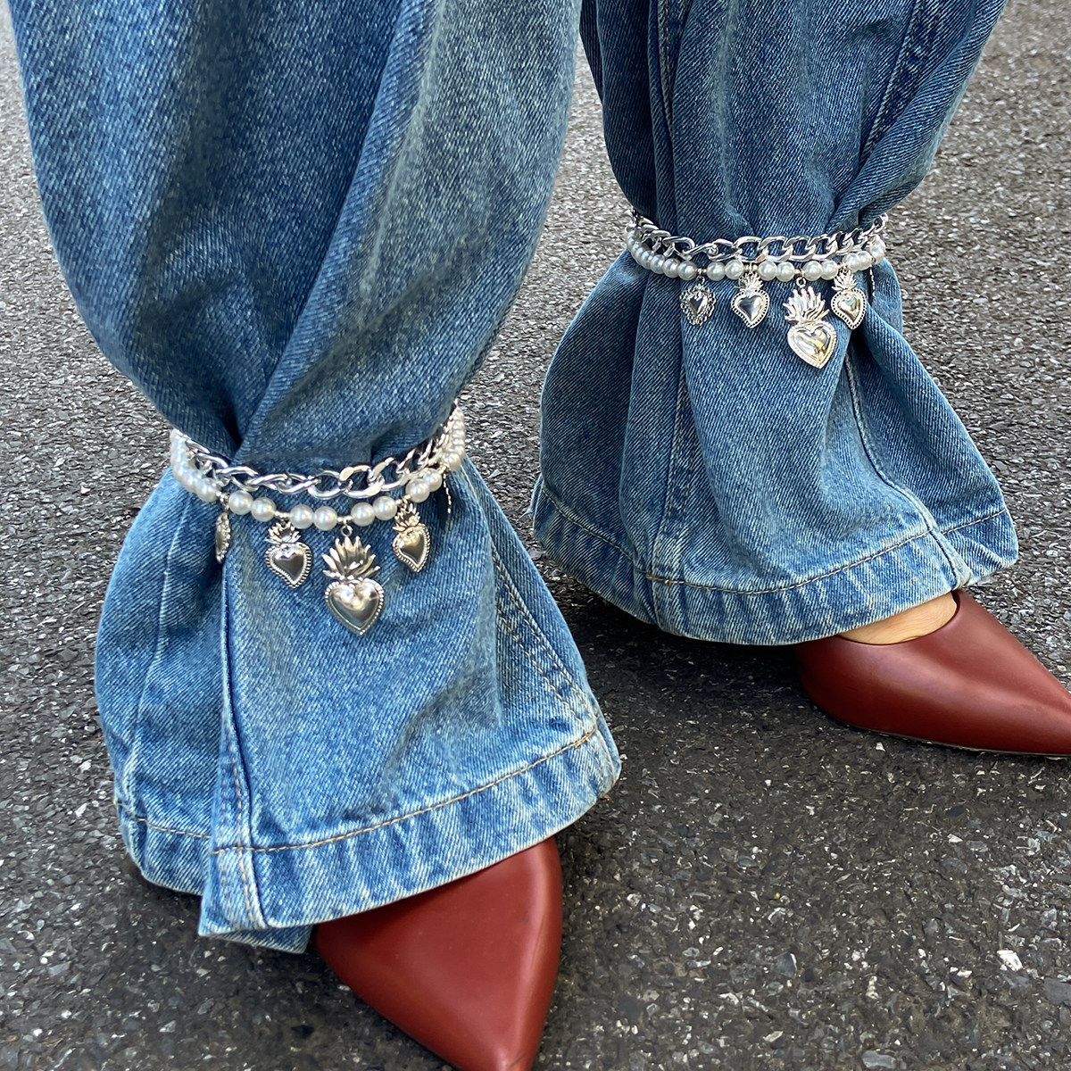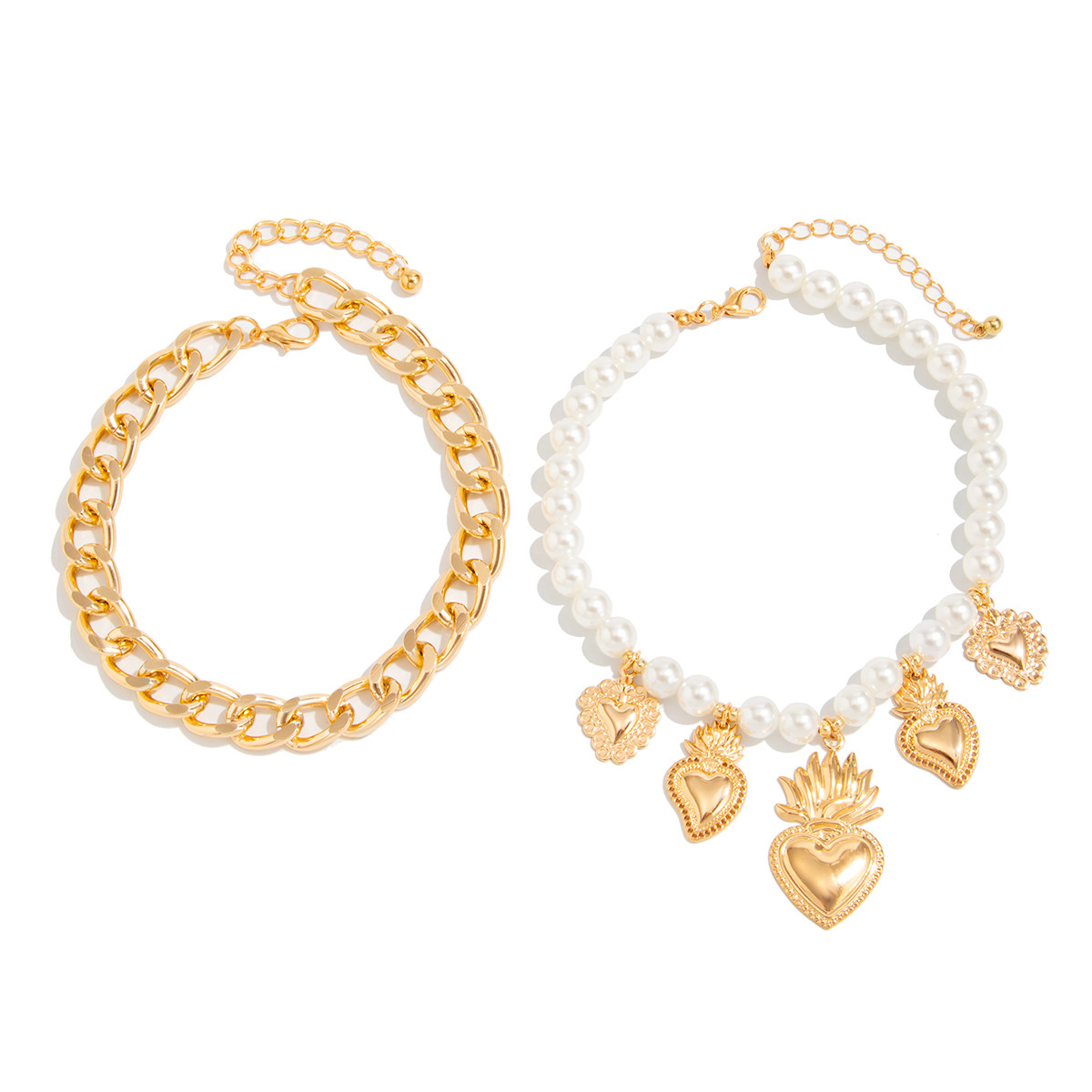 饰品酷 潮流女生街拍装 2件套仿珍珠桃心磨链脚链套装 欧美嘻哈时尚