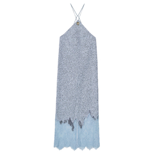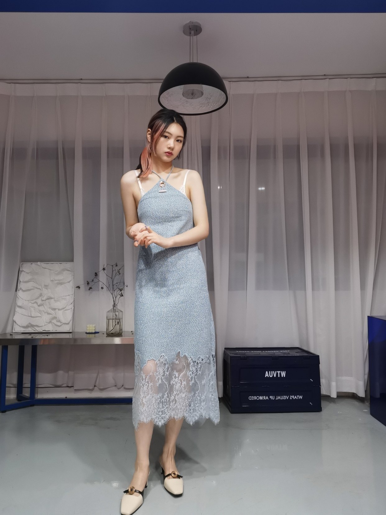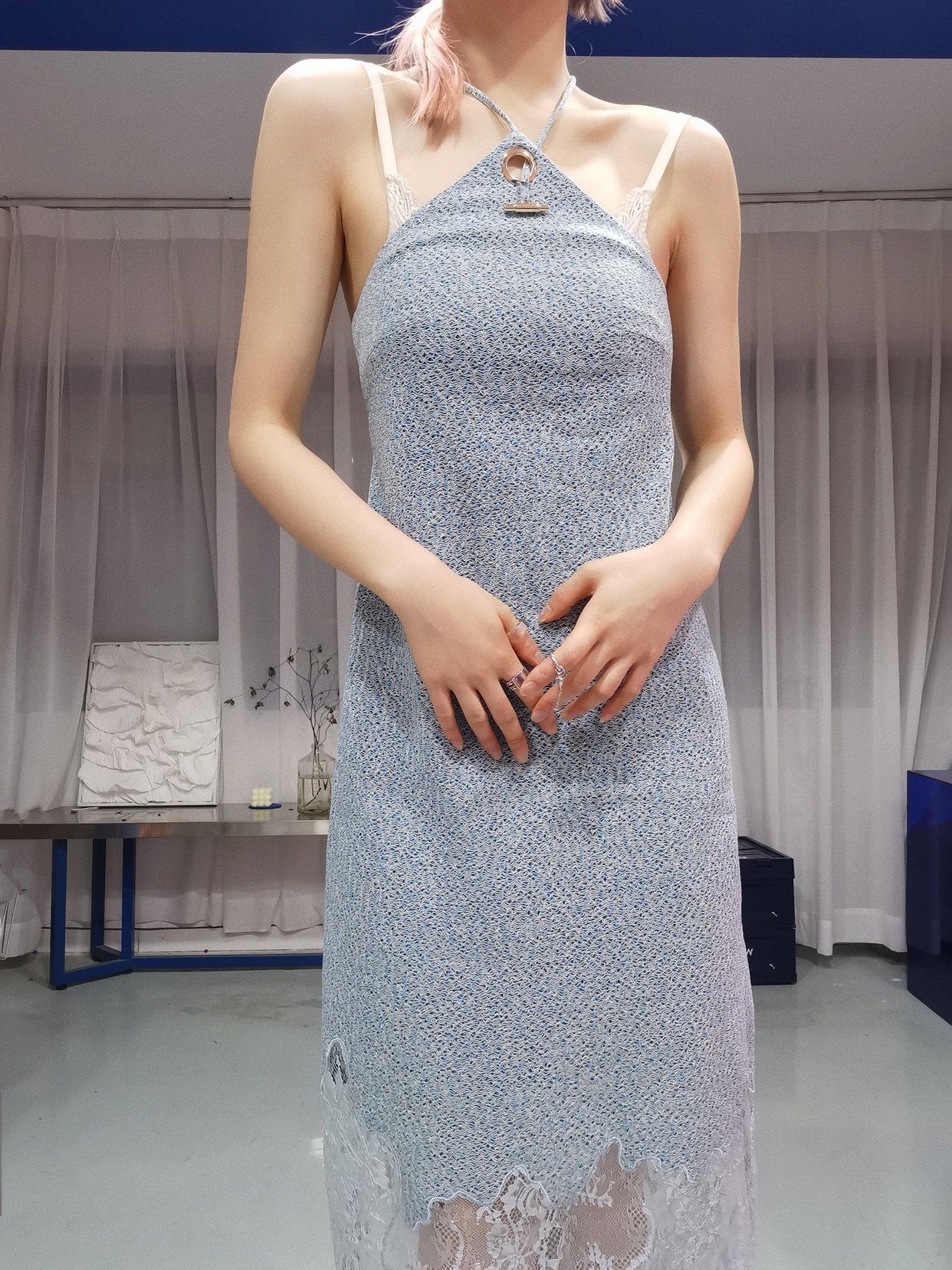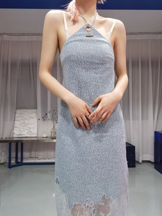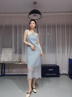 蓝色长裙韩国代购 蕾丝吊带连衣裙挂脖修身 2020春夏新款 YCH