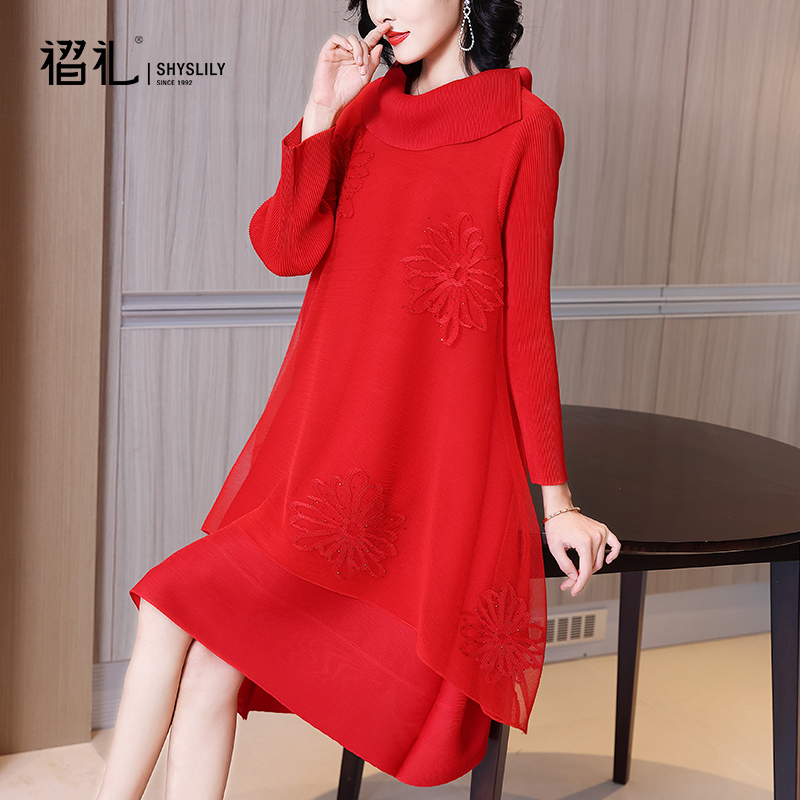 洋气喜婆婆婚宴装 妈妈高端网纱红色连衣裙春秋季 宽松大码 长袖 新款