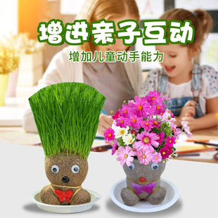 长草娃娃草头开花小盆栽植物头上头顶浇水种草幼儿园儿童水培绿植