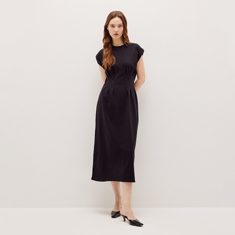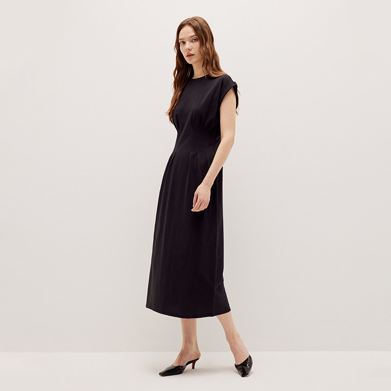 FRAME女士小圆领褶皱收腰短袖 A字连衣裙小黑裙