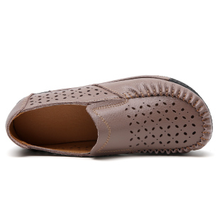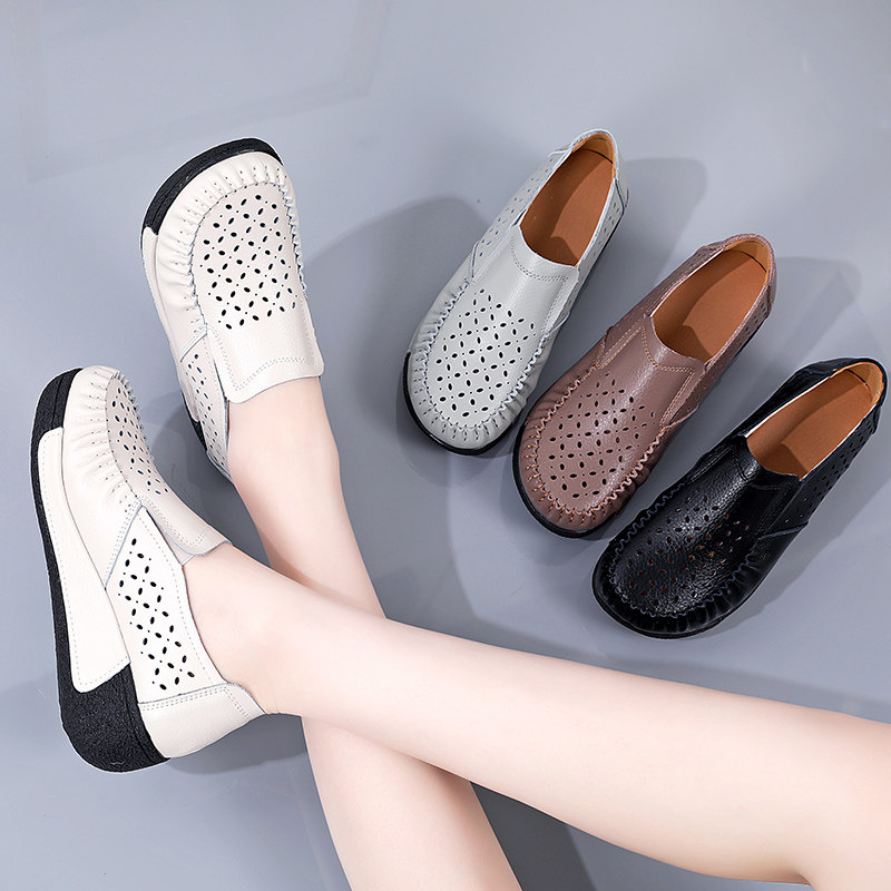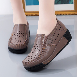 休闲中年妈妈鞋 洞洞鞋 一脚蹬松糕凉鞋 夏新镂空透气女真皮坡跟单鞋
