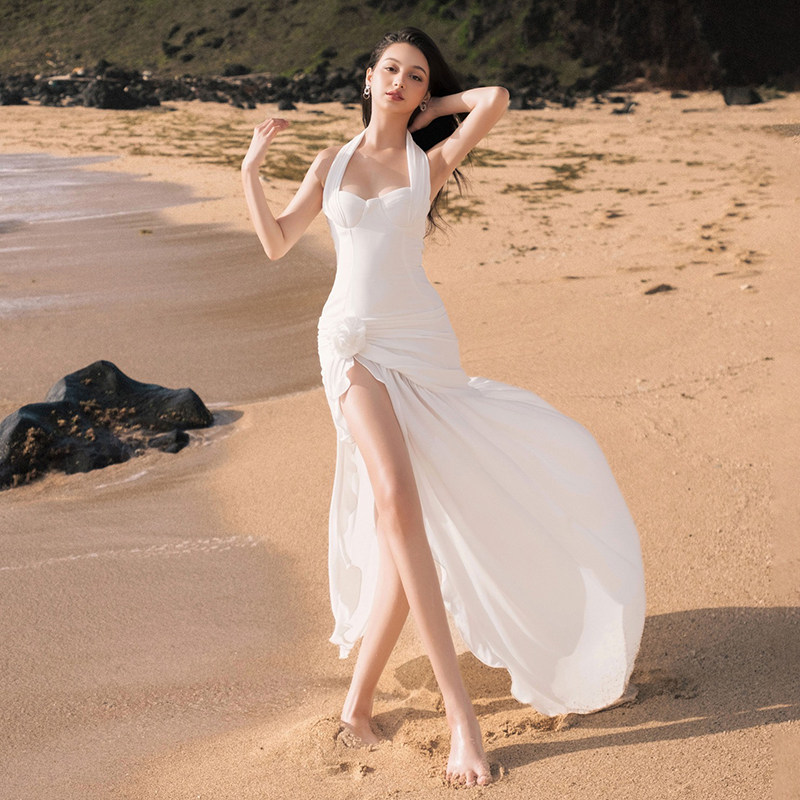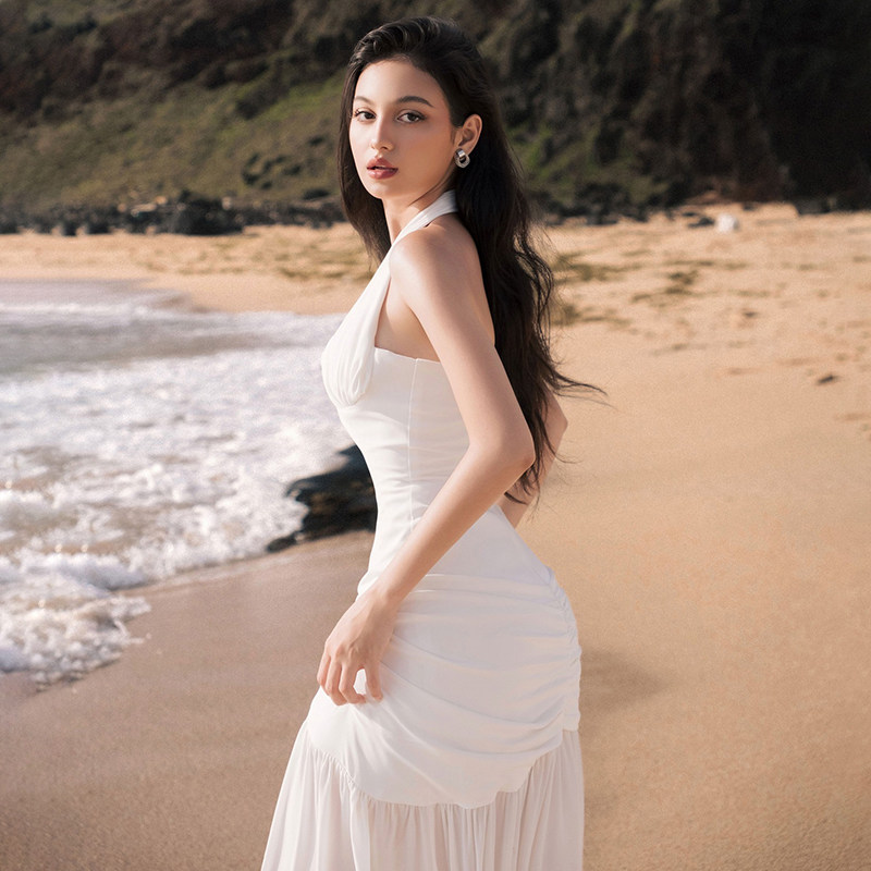 SylCue 白月光挂脖吊带连衣裙褶皱开叉辣妹长裙夏 仙女度假风法式