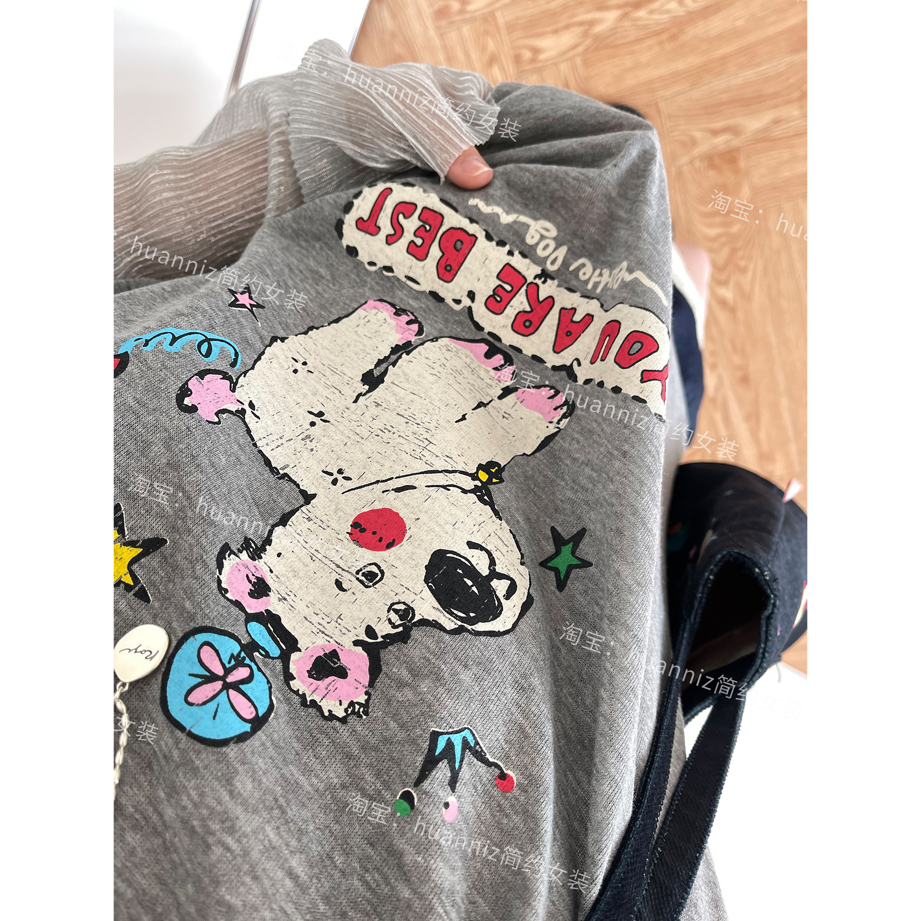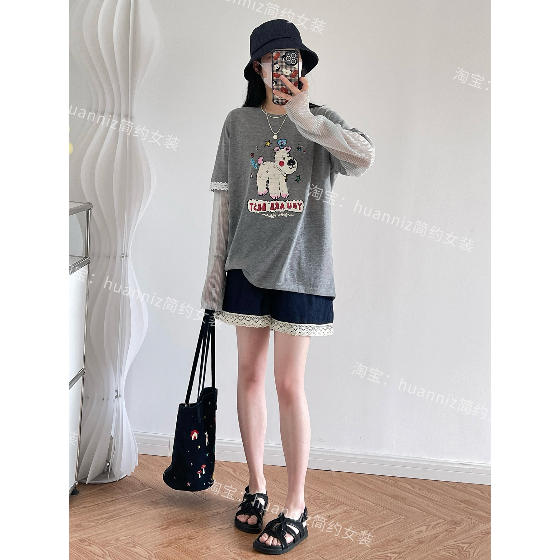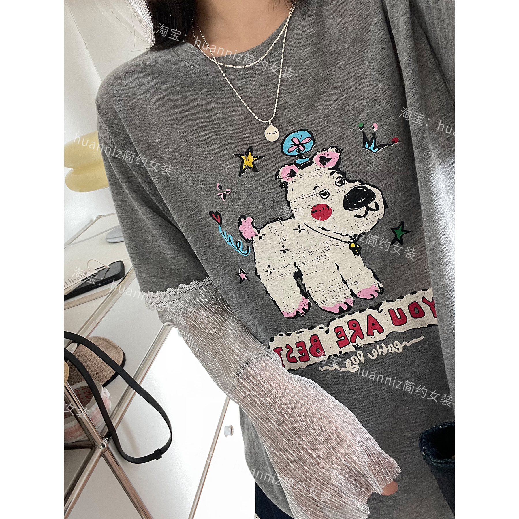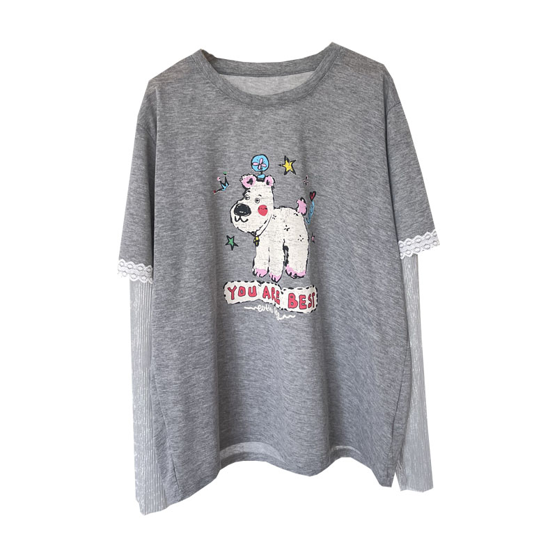 设计感网纱长袖 减龄上衣女 拼接假两件防晒T恤小狗印花宽松大版