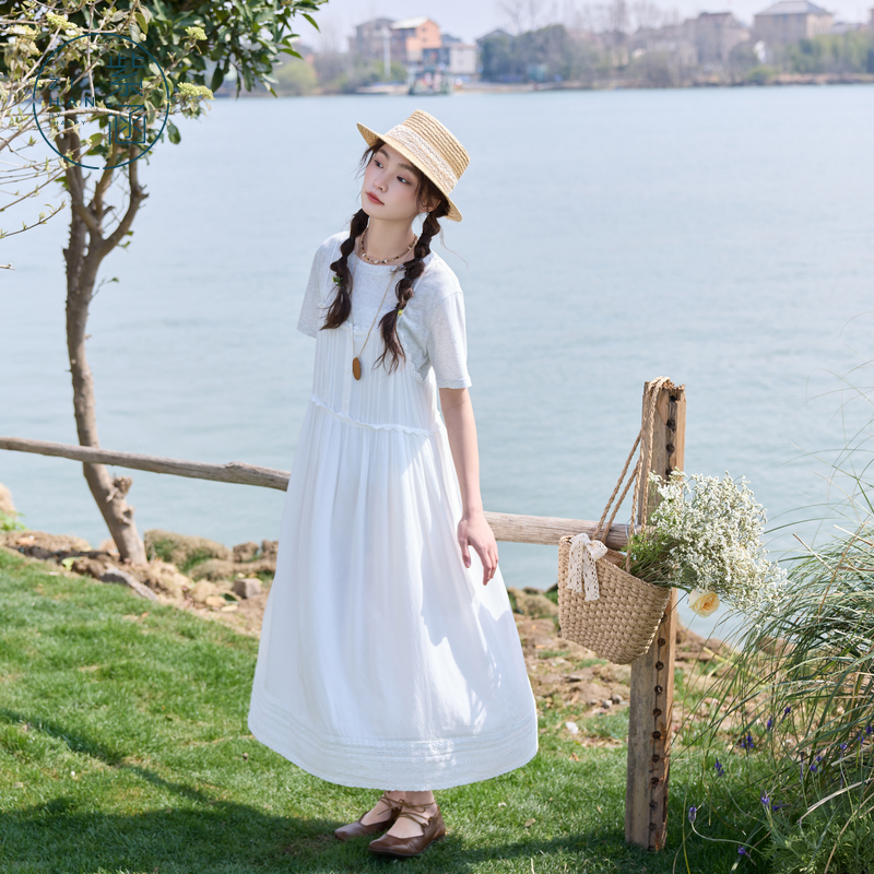 新款 女2025年夏季 T恤宽松大裙摆吊带连衣裙两件套装 紫涵圆领短袖