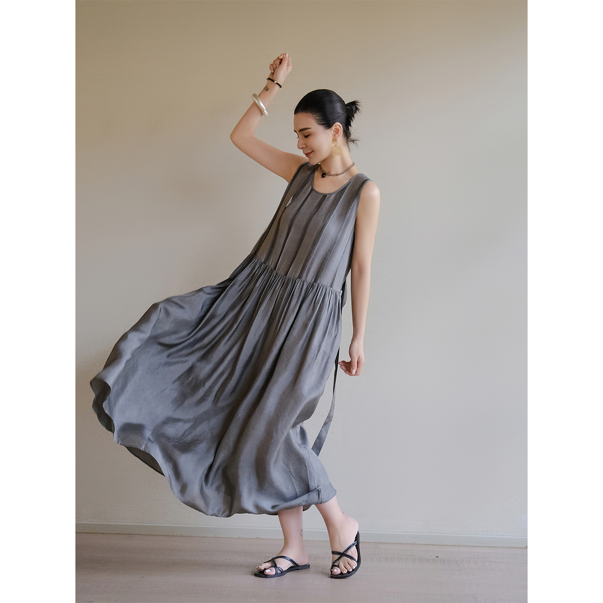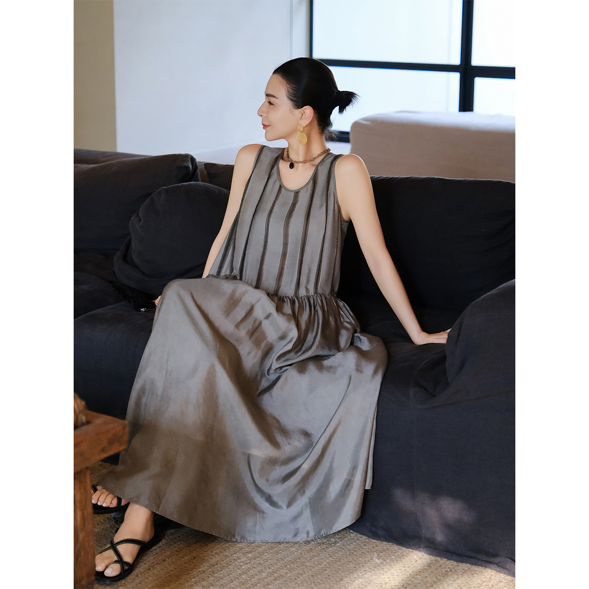 麻霖18姆米桑蚕丝混纺竖条纹剪花炒色大圆领无袖 连衣裙 优雅时尚