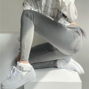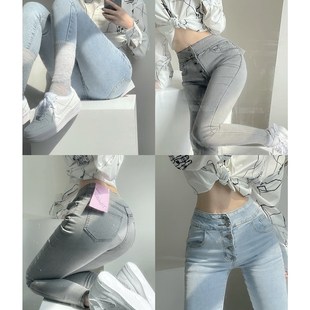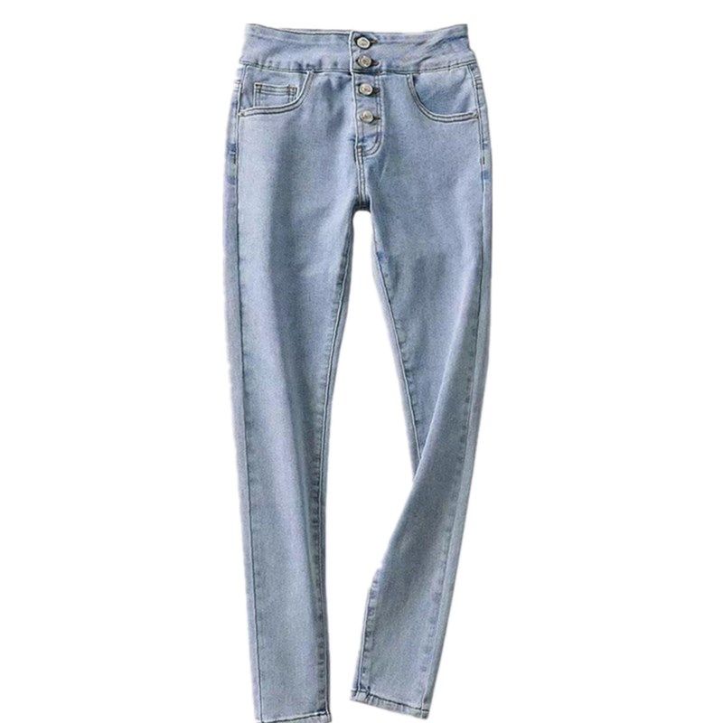 显瘦弹力铅笔裤 女包臀修身 四排扣浅蓝高腰牛仔小脚裤 撩男于无形