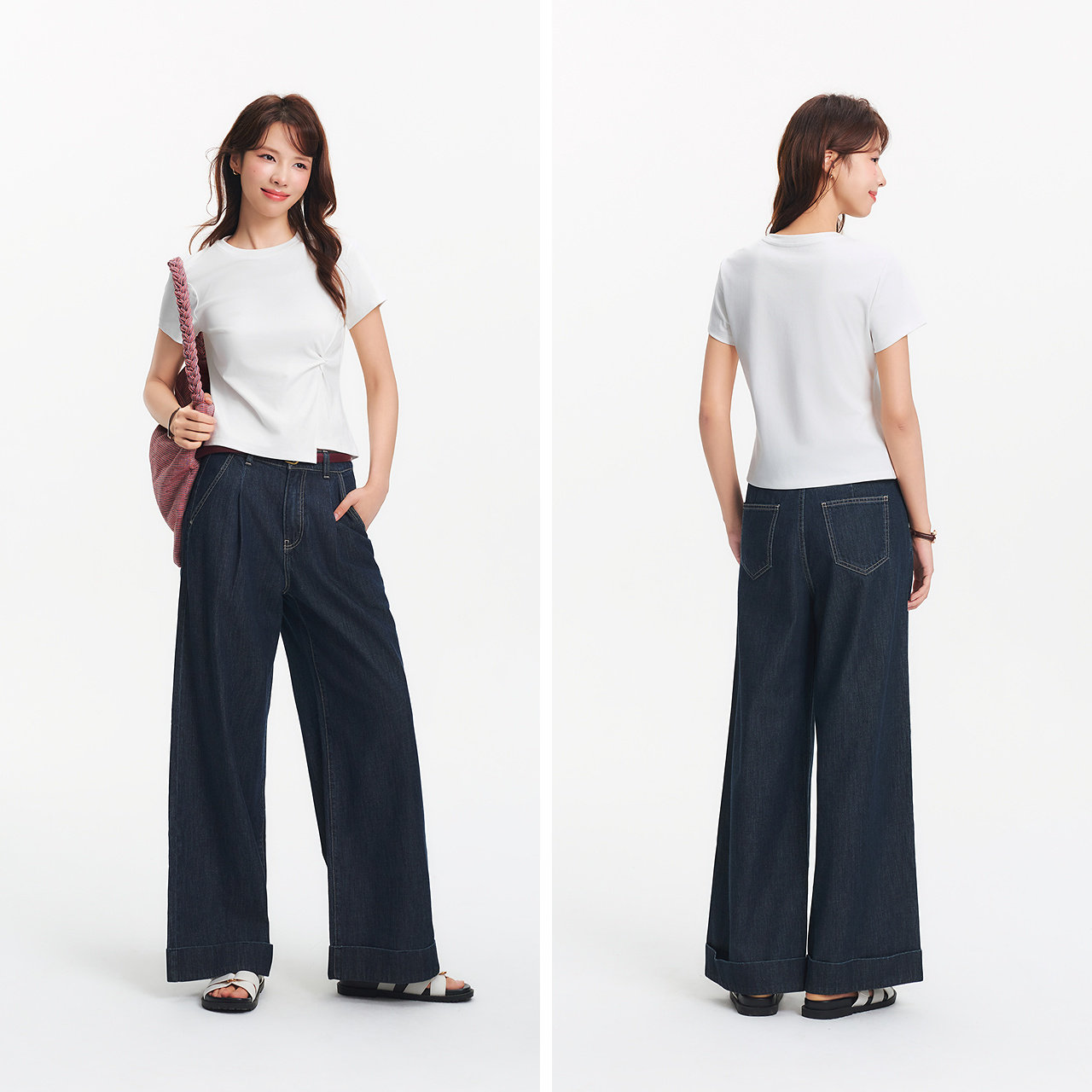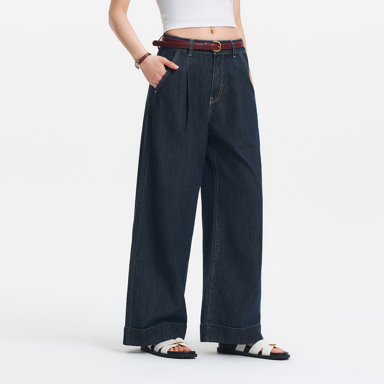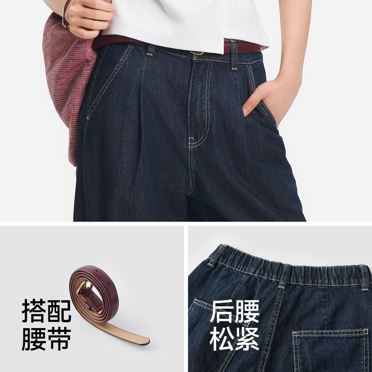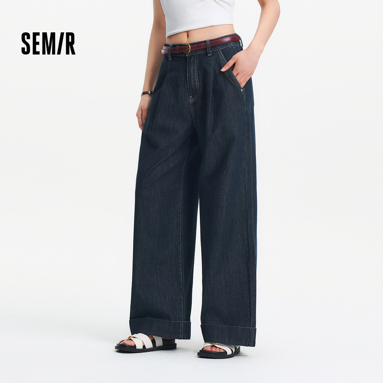 高街长裤 腰带显瘦潮酷时尚 女夏半松紧腰纯棉宽松阔腿裤 森马牛仔裤