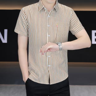 条纹衬衫 短袖 潮流时髦韩版 修身 弹力抗皱衬衣 男士 痞帅冰丝薄款 夏装