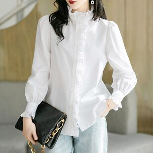 韩系洋气立领100%纯棉打底长袖 新款 上衣木耳边衬衣外穿 女秋季 衬衫