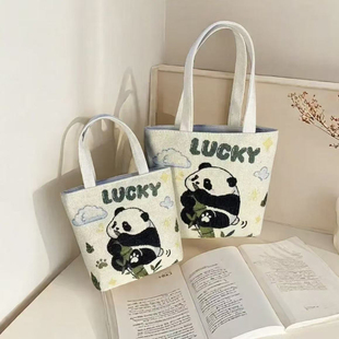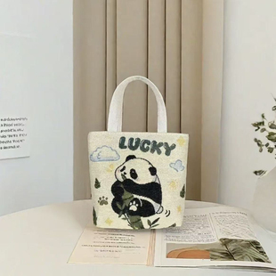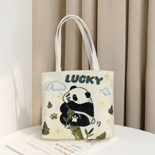 新款 升级竹节小熊猫双面针织刺绣休闲百搭帆布手提单肩包卡通清新