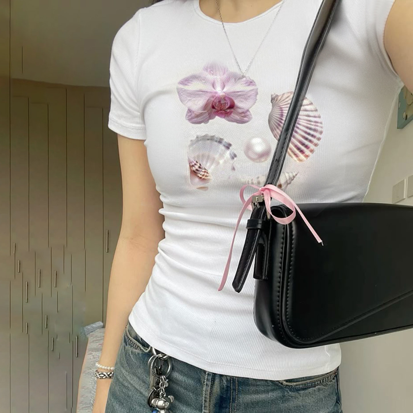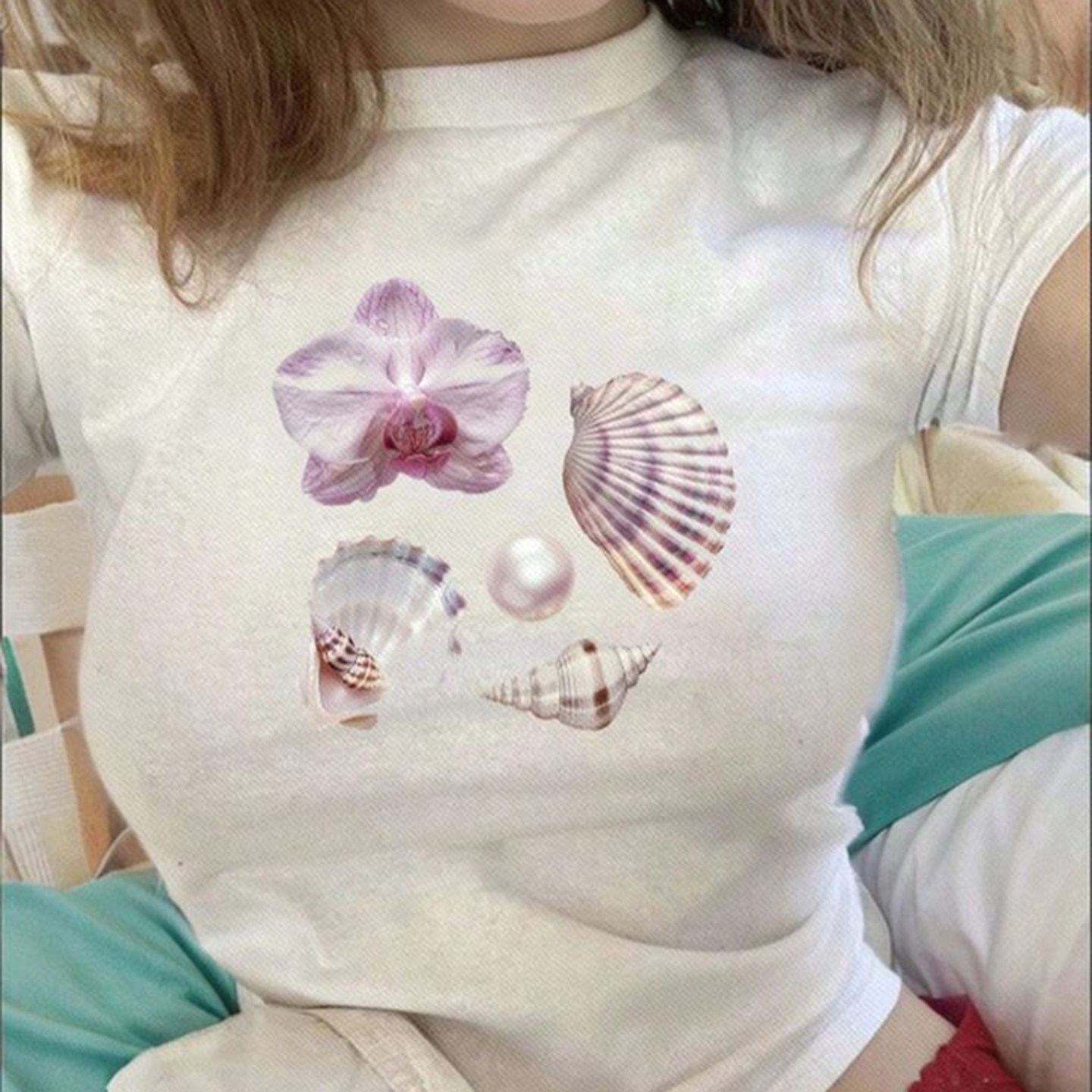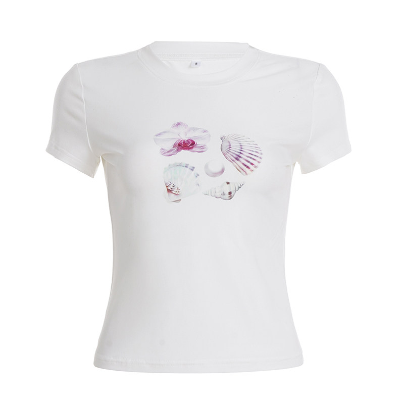 t恤休闲度假风修身 贝壳印花白色短袖 短上衣 甜美少女 ROCKMORE
