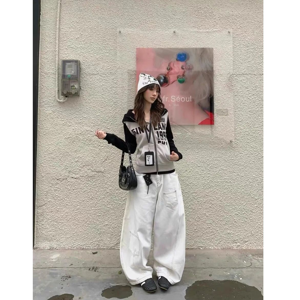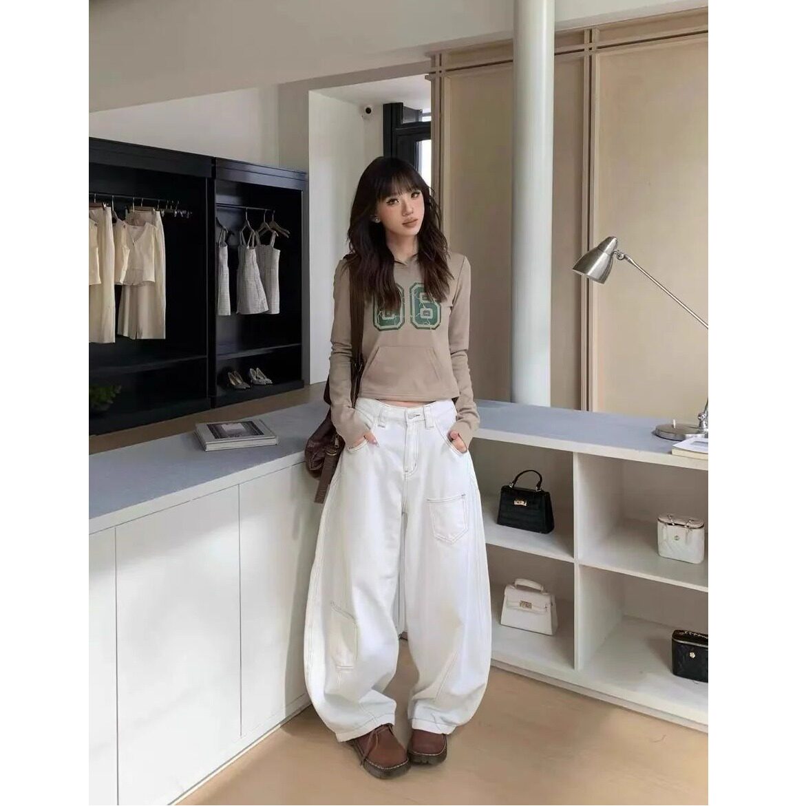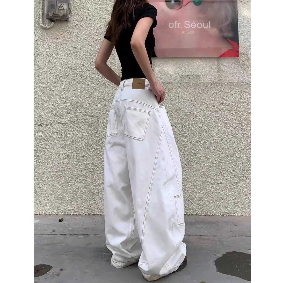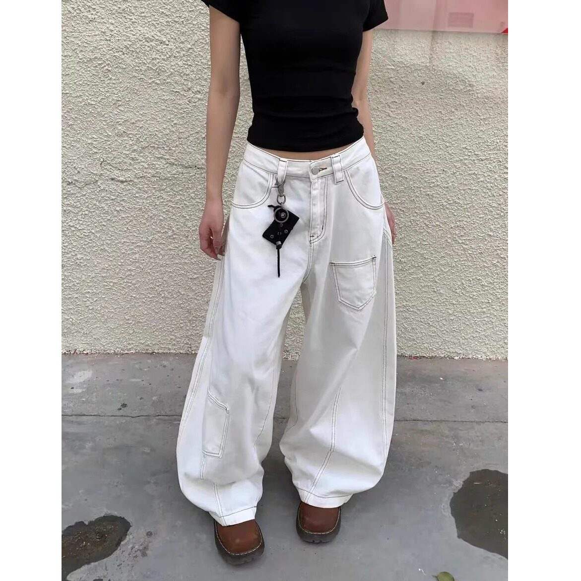 显瘦宽松明显口袋设计垂感长裤 美式 女款 牛仔裤 复古白色阔腿弯刀裤