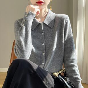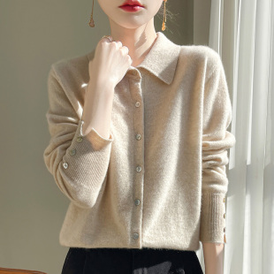 上衣 女POLO领纯色针织毛衣外套宽松羊绒衫 2025秋季 100%纯羊毛开衫