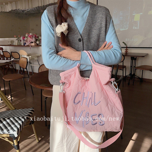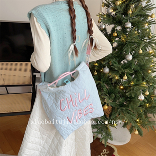 小白兔几 字母刺绣绗缝手提包轻便斜挎包 秋冬嫩黄色帆布包袋韩版