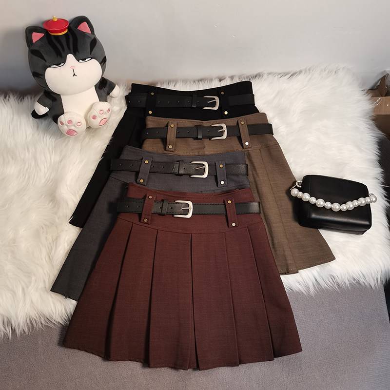 pusumede 复古卡其色麂皮高腰a字半身裙女直筒包臀短裙 配腰带