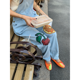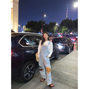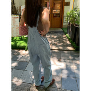 设计感条纹印花牛仔背带裤 2024新款 女小个子 宽松连身裤 落落狷介