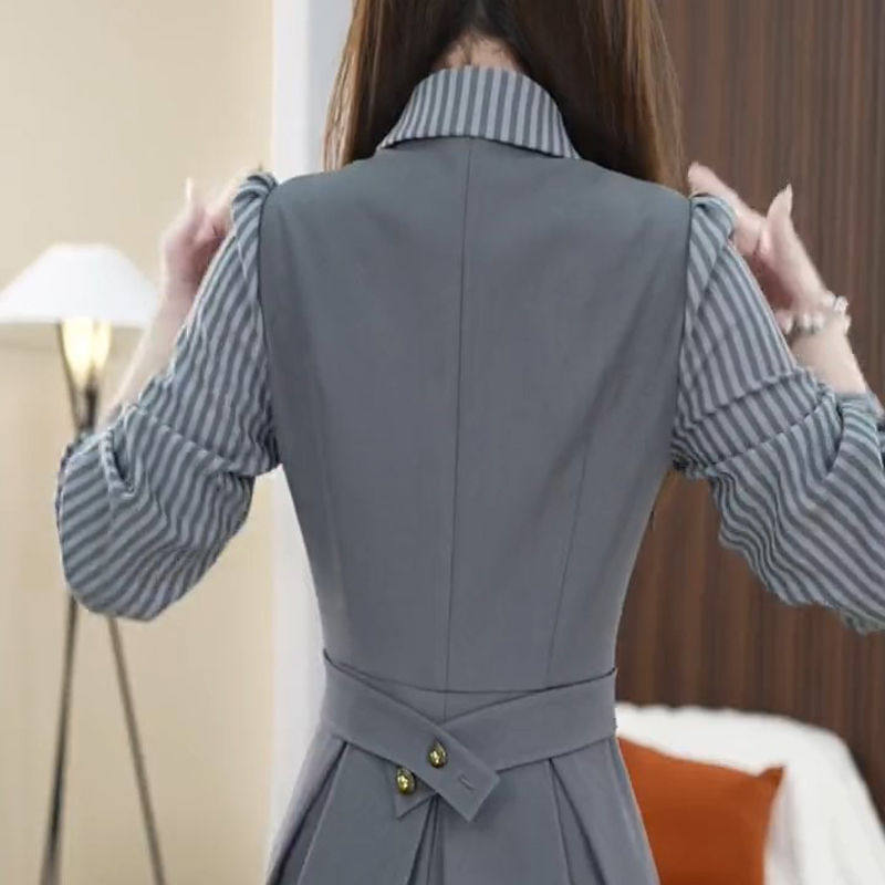 假两件长袖 时尚 连衣裙气质收腰显瘦条纹拼接休闲裙子 新款 2025秋季
