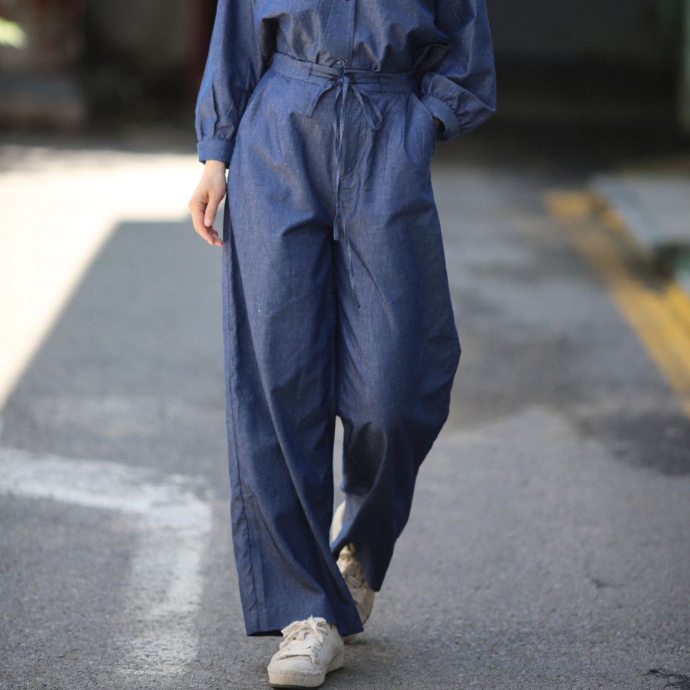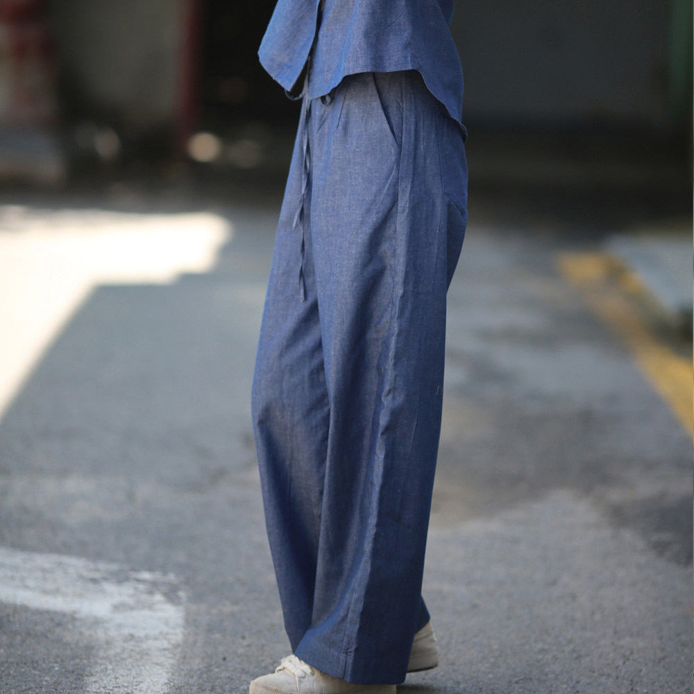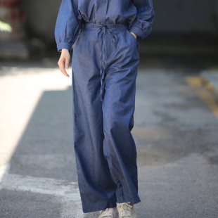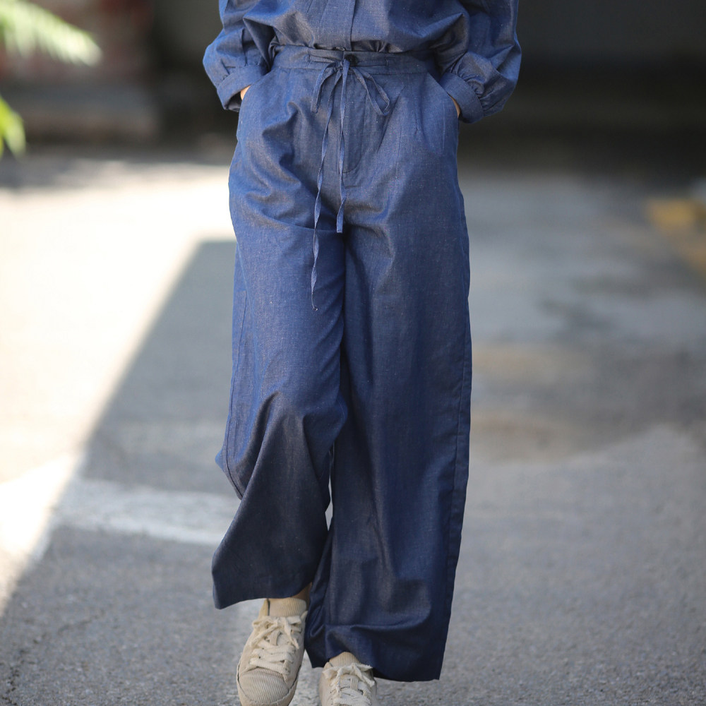 游设计原创拉链抽绳腰天丝亚麻阔腿裤 蓝双