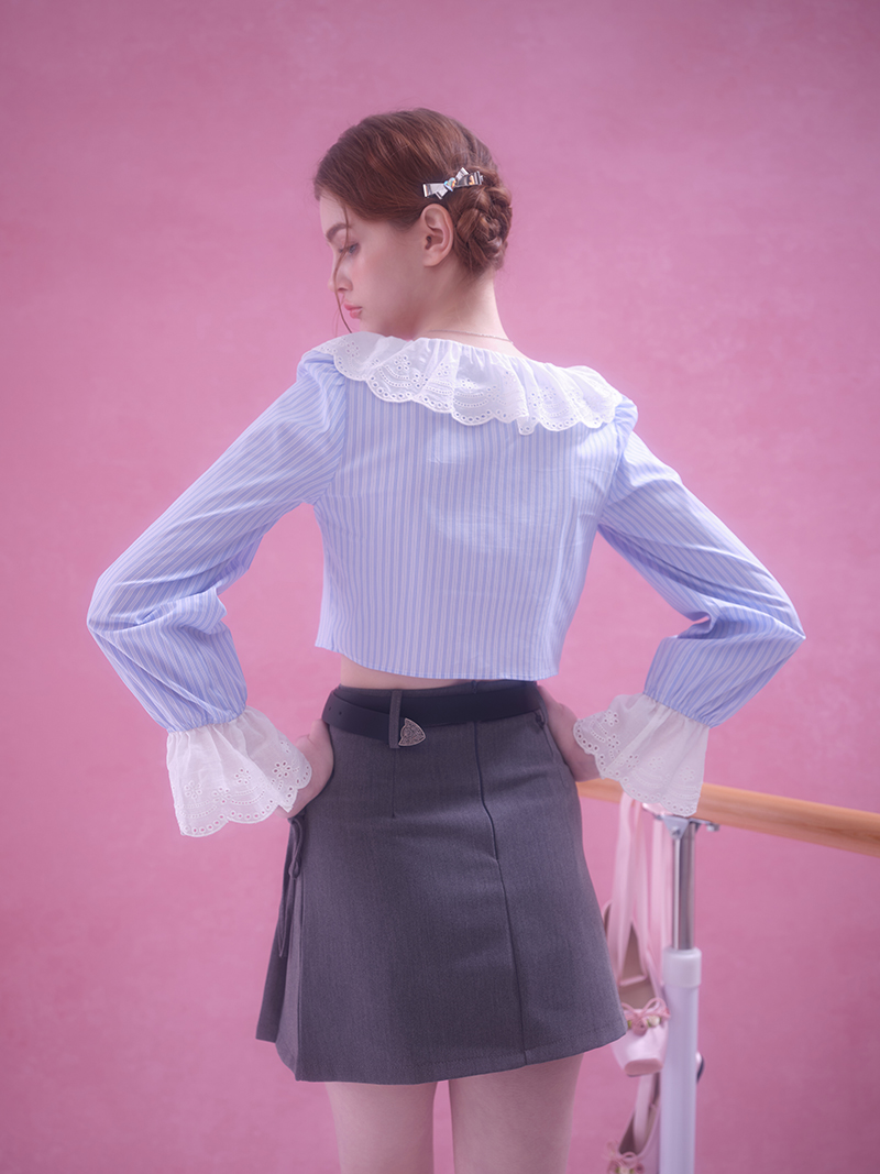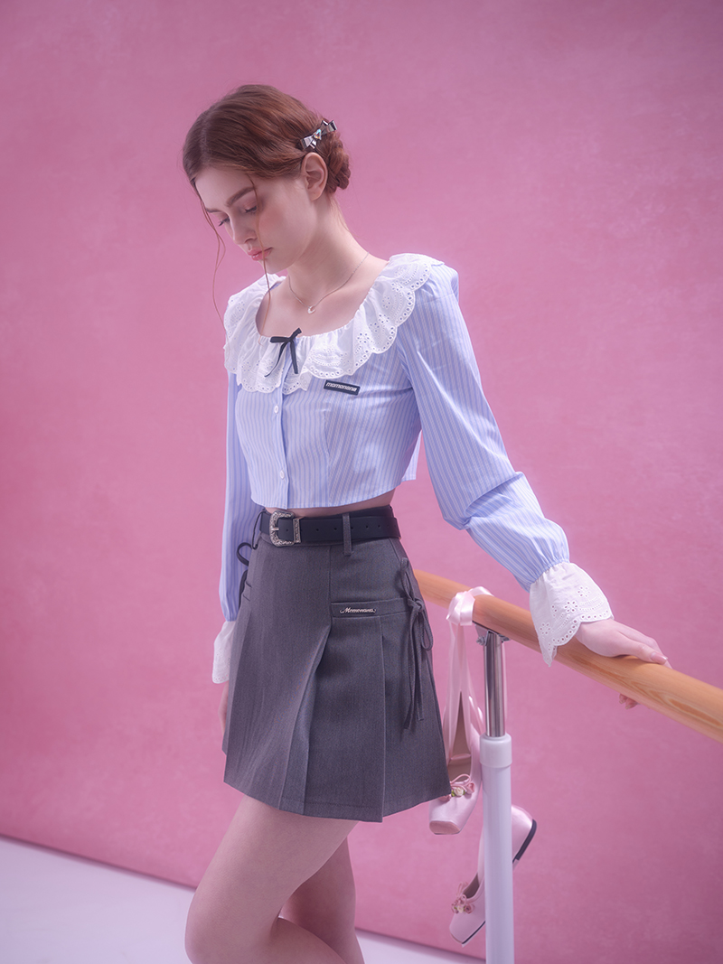 MOMONANA沈梦辰同款 蕾丝领蓝色条纹学院风侧边蝴蝶结百褶高腰短裙