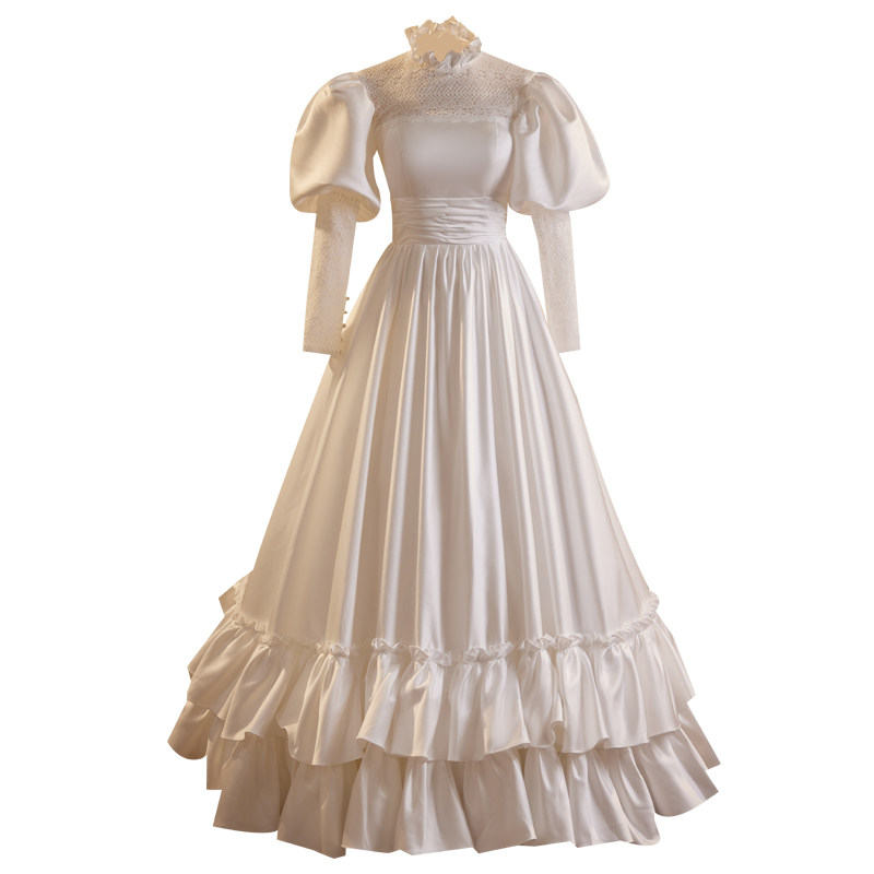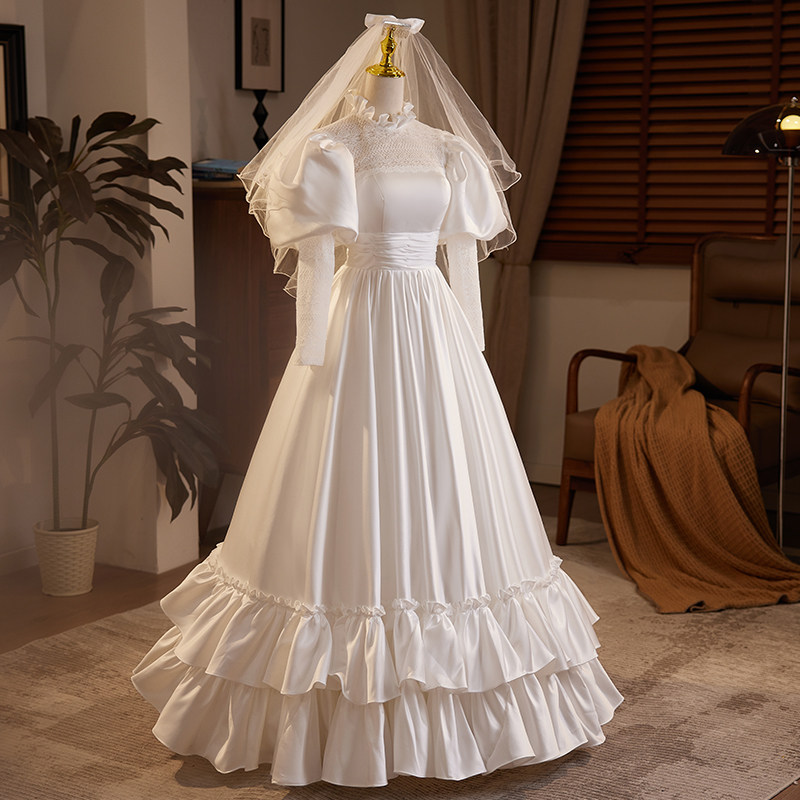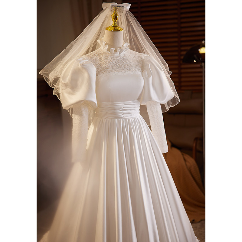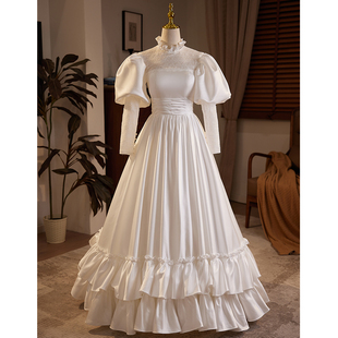 礼服 迎宾纱旅拍轻婚纱古着蕾丝长袖 法式 古董缎面复古新娘2025新款