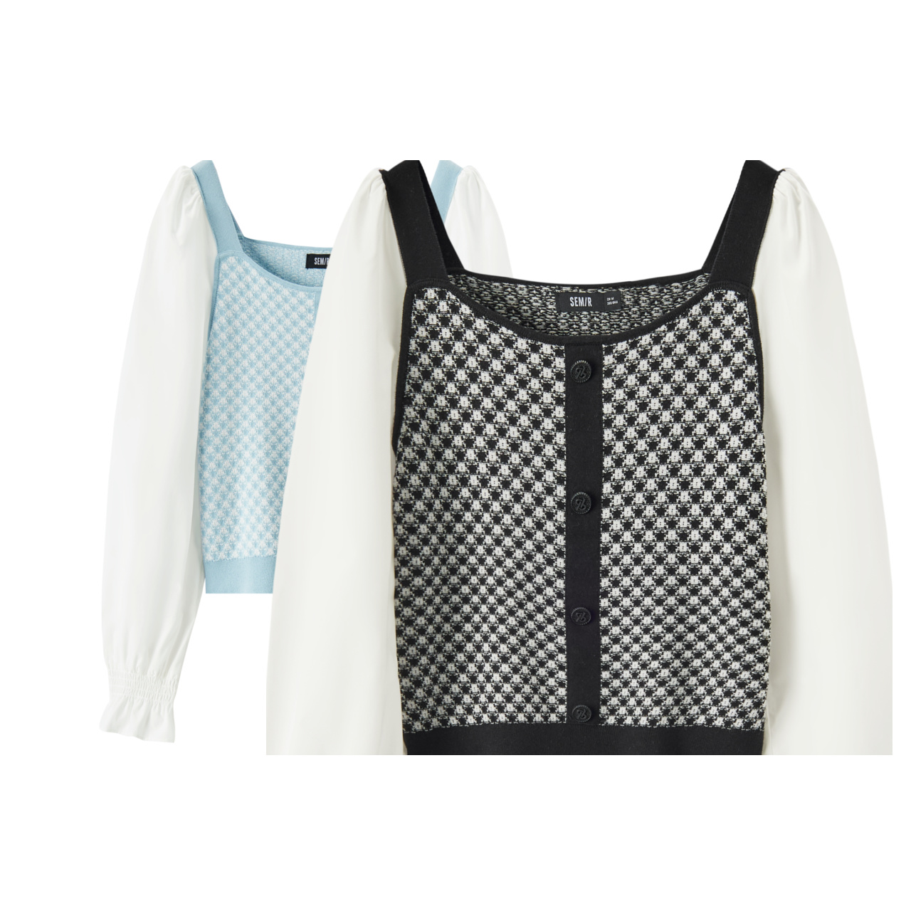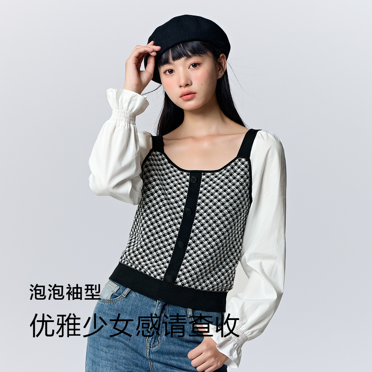 优雅少女感秋修身 森马长袖 拼接泡泡袖 女短款 方领提花上衣显瘦 衬衫