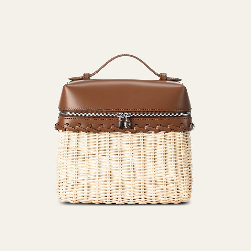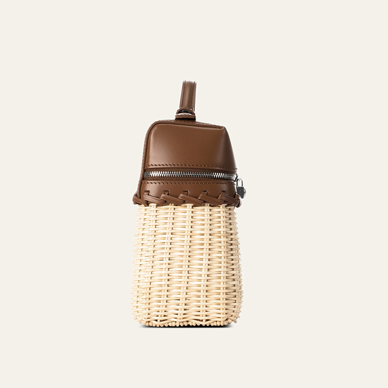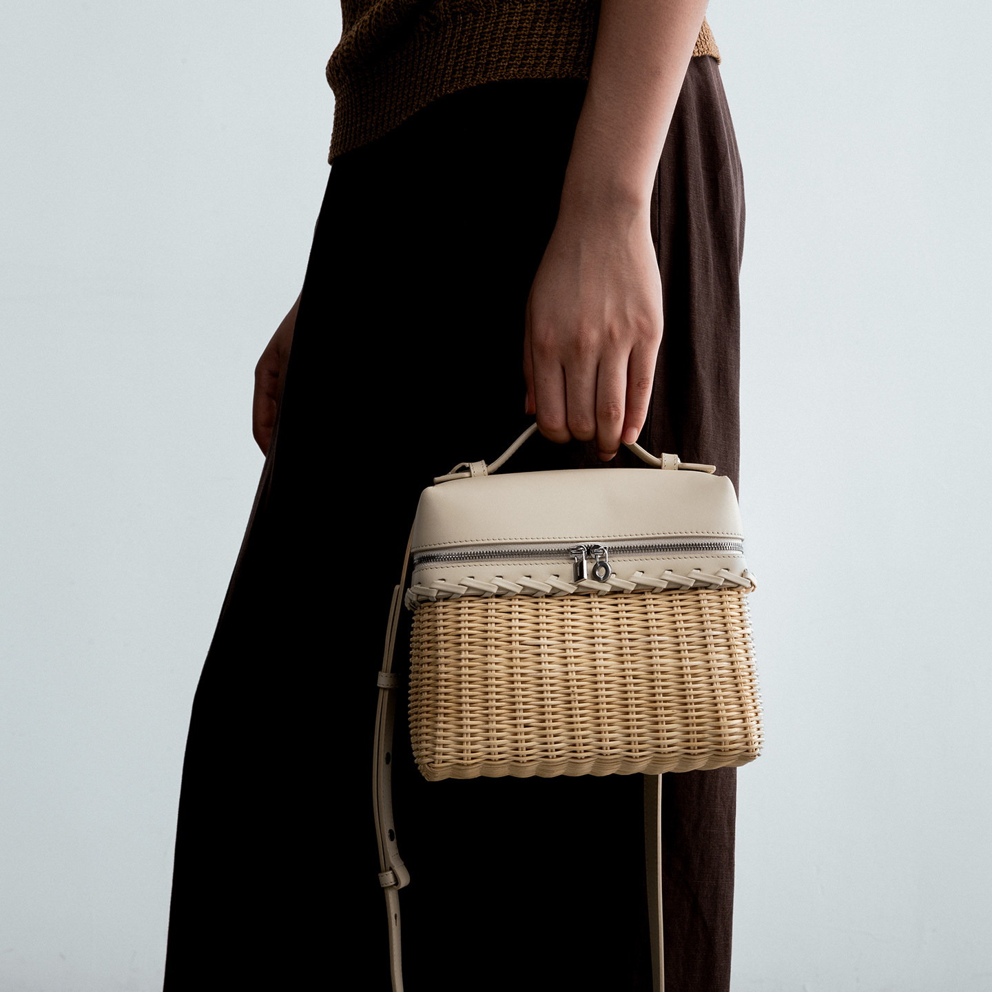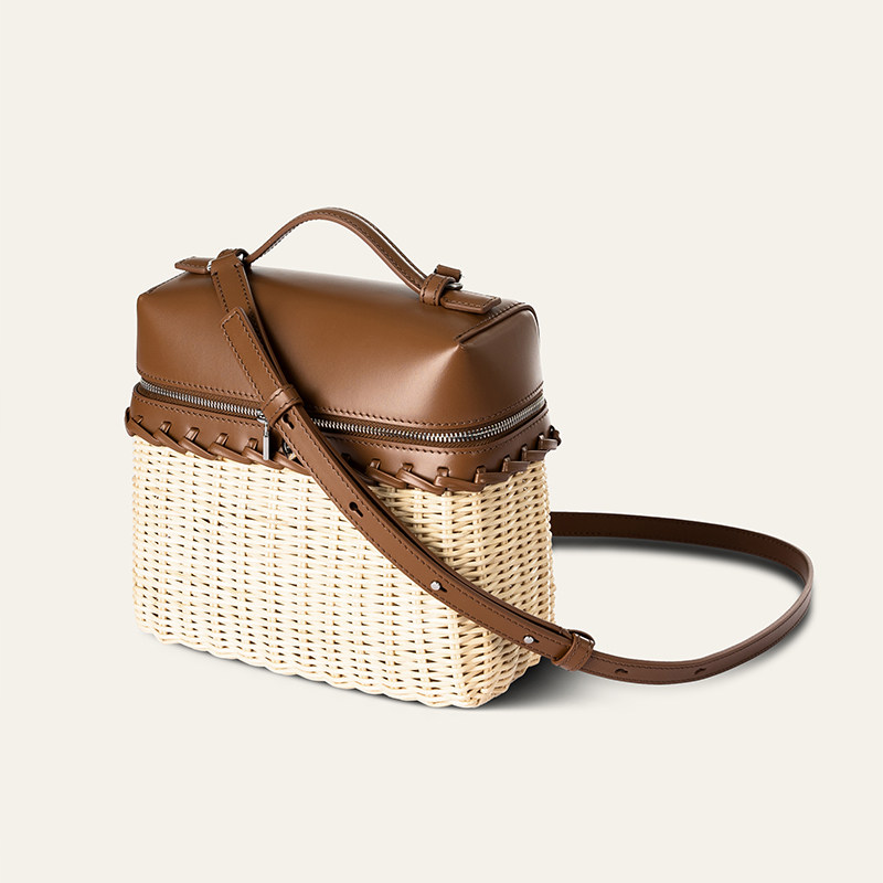 kikani lp藤编包小方盒牛皮竹编包女士野餐编织包单肩斜挎手提包