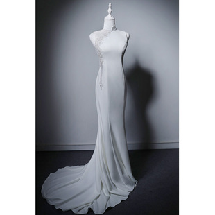 MISSQIAN 旗袍领蕾丝鱼尾裙纯白色新娘结订婚敬酒服轻婚纱旅拍女