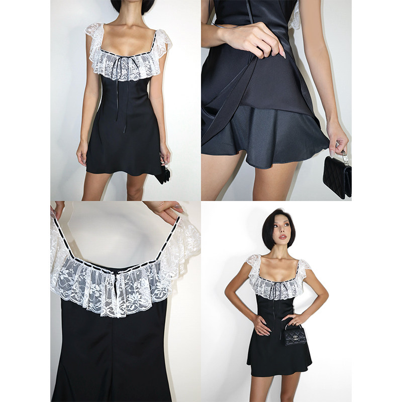 纯欲一字肩连衣裙蕾丝花边拼接性感露肩抹胸短裙 法式 5折