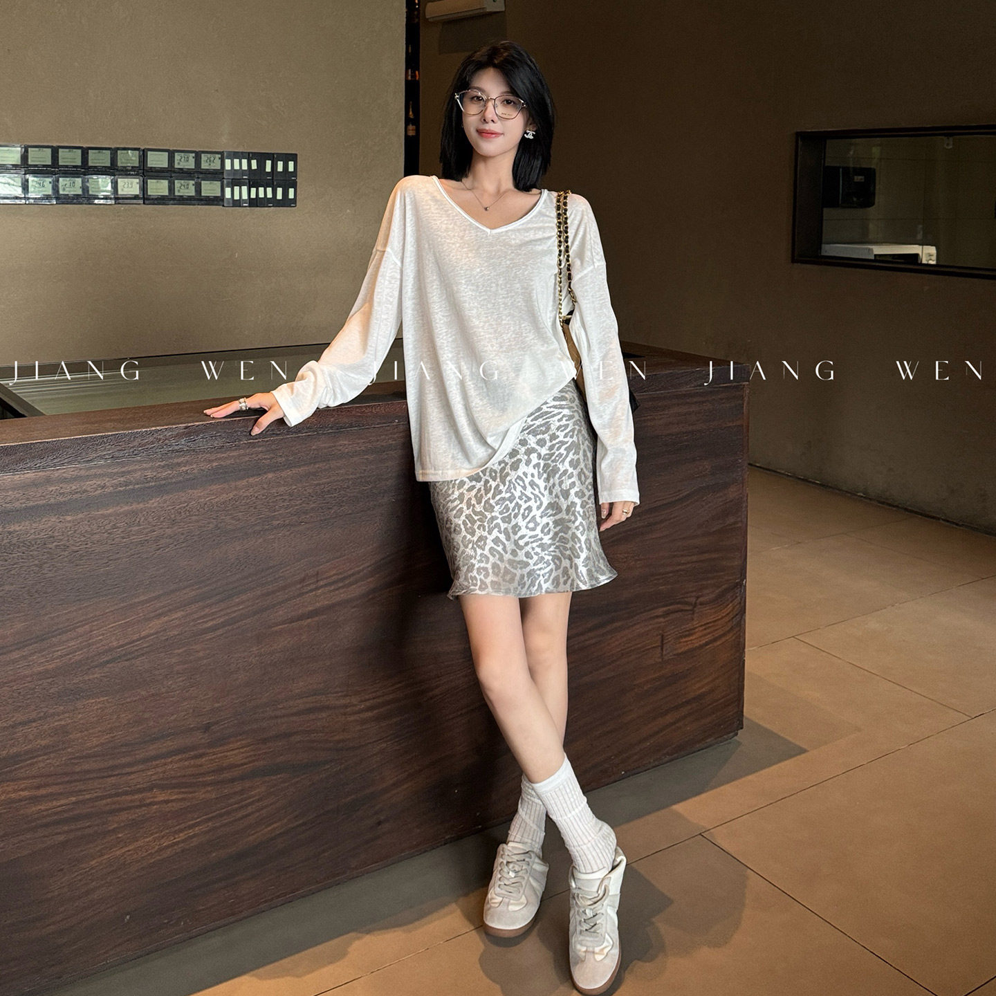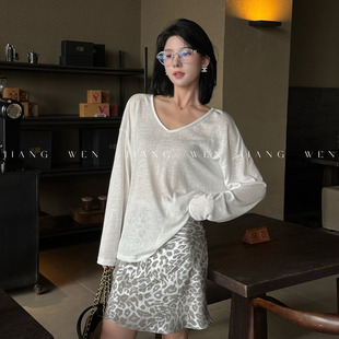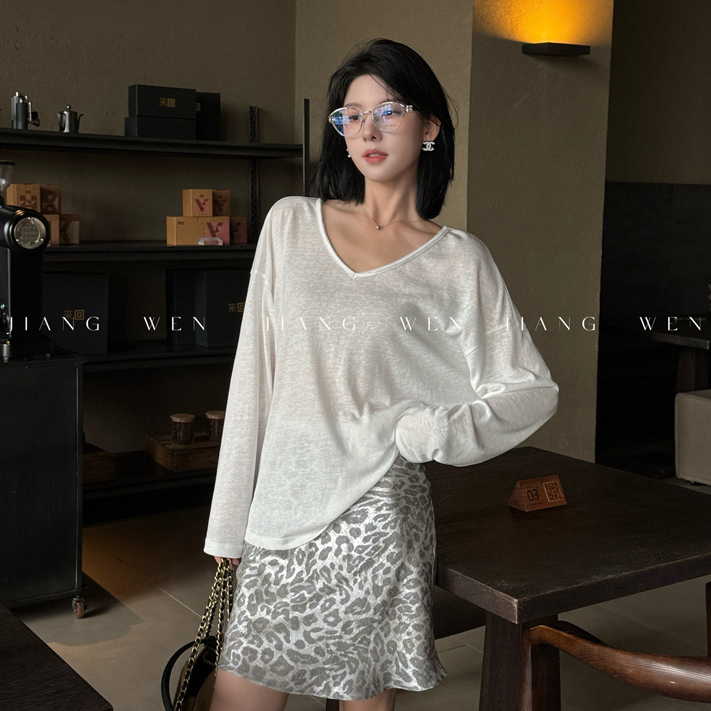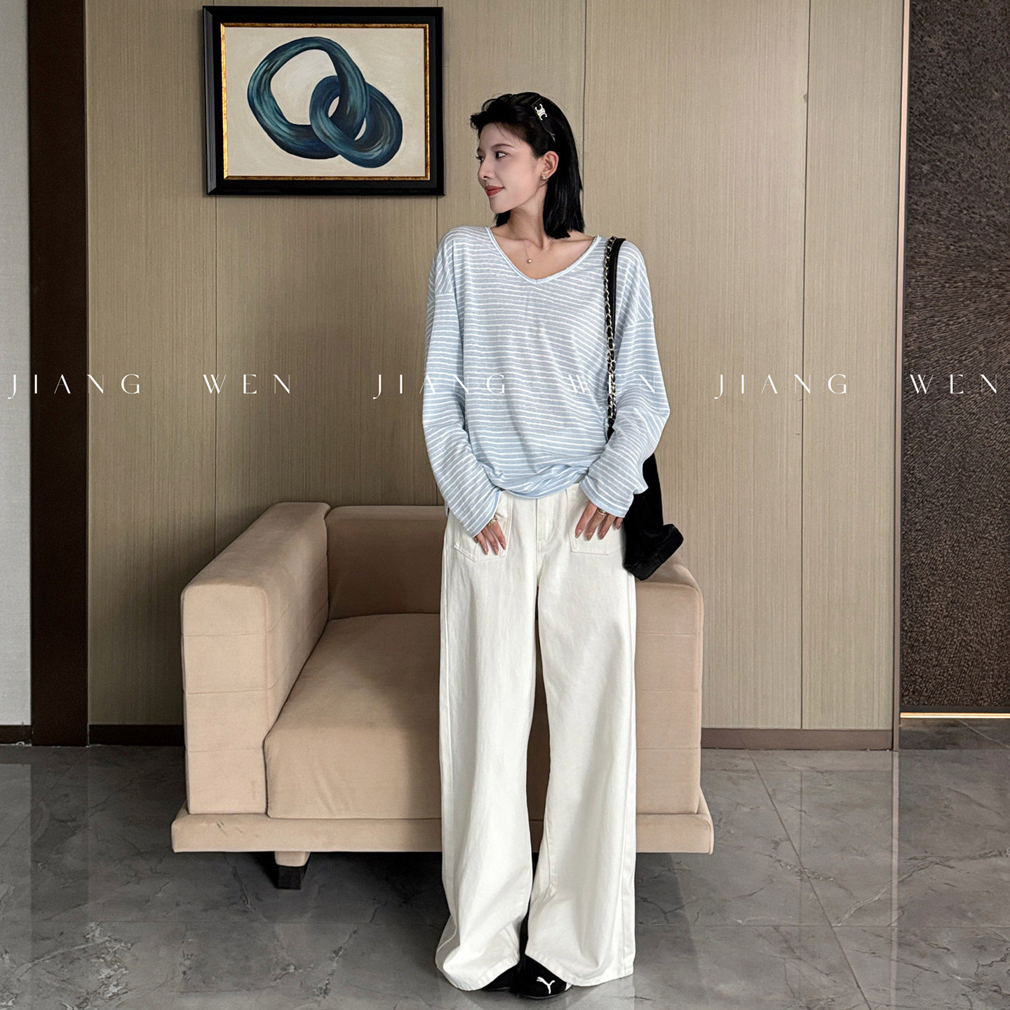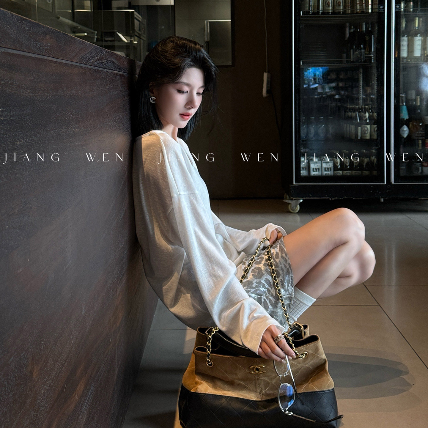 后背镂空巨好看设计感白色薄纱上衣条纹T恤秋 女长袖 姜雯 防晒罩衫