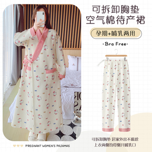 可拆卸带胸垫空气棉春秋冬季 加厚产后喂奶哺乳中长睡裙纯棉月子服
