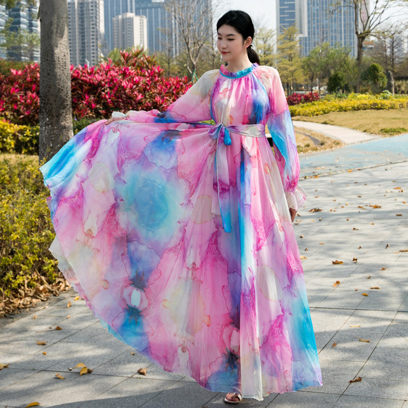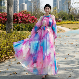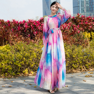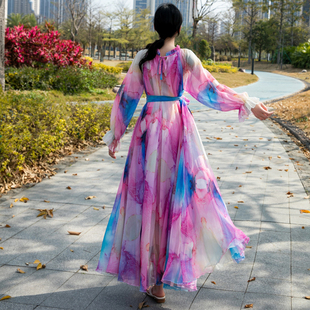 夏长袖 波西米亚沙滩裙女神印花雪纺长裙连衣裙气质飘逸仙女裙 大码