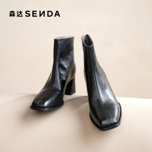 森达奶酪靴弹力靴女冬季 复古气质方头粗高跟瘦瘦靴短靴 新款