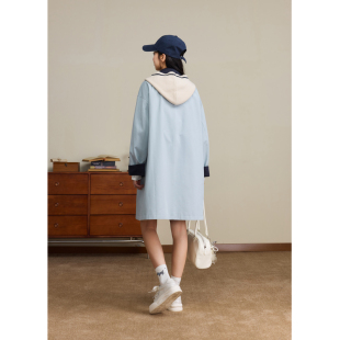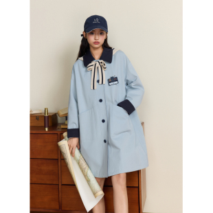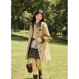 英伦学院风宽松单排扣外套 新款 紫涵撞色翻领中长款 卡其风衣女秋季