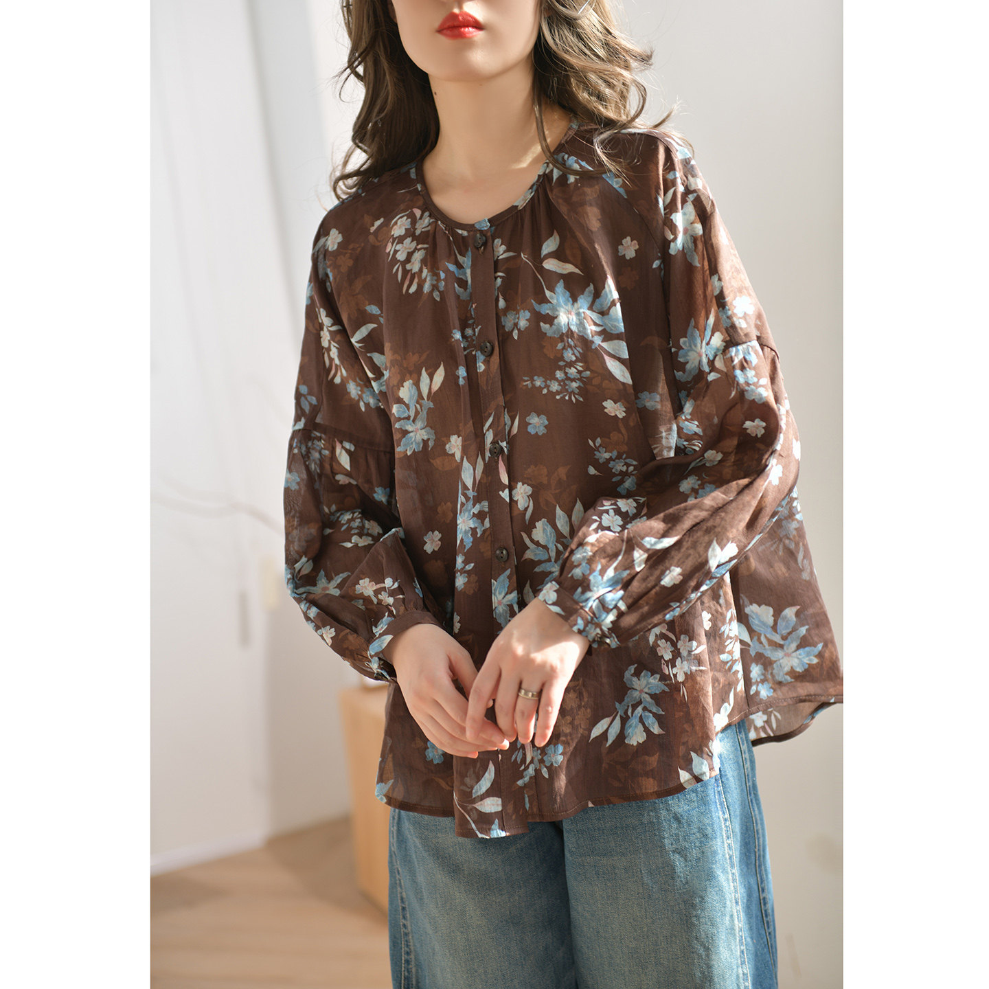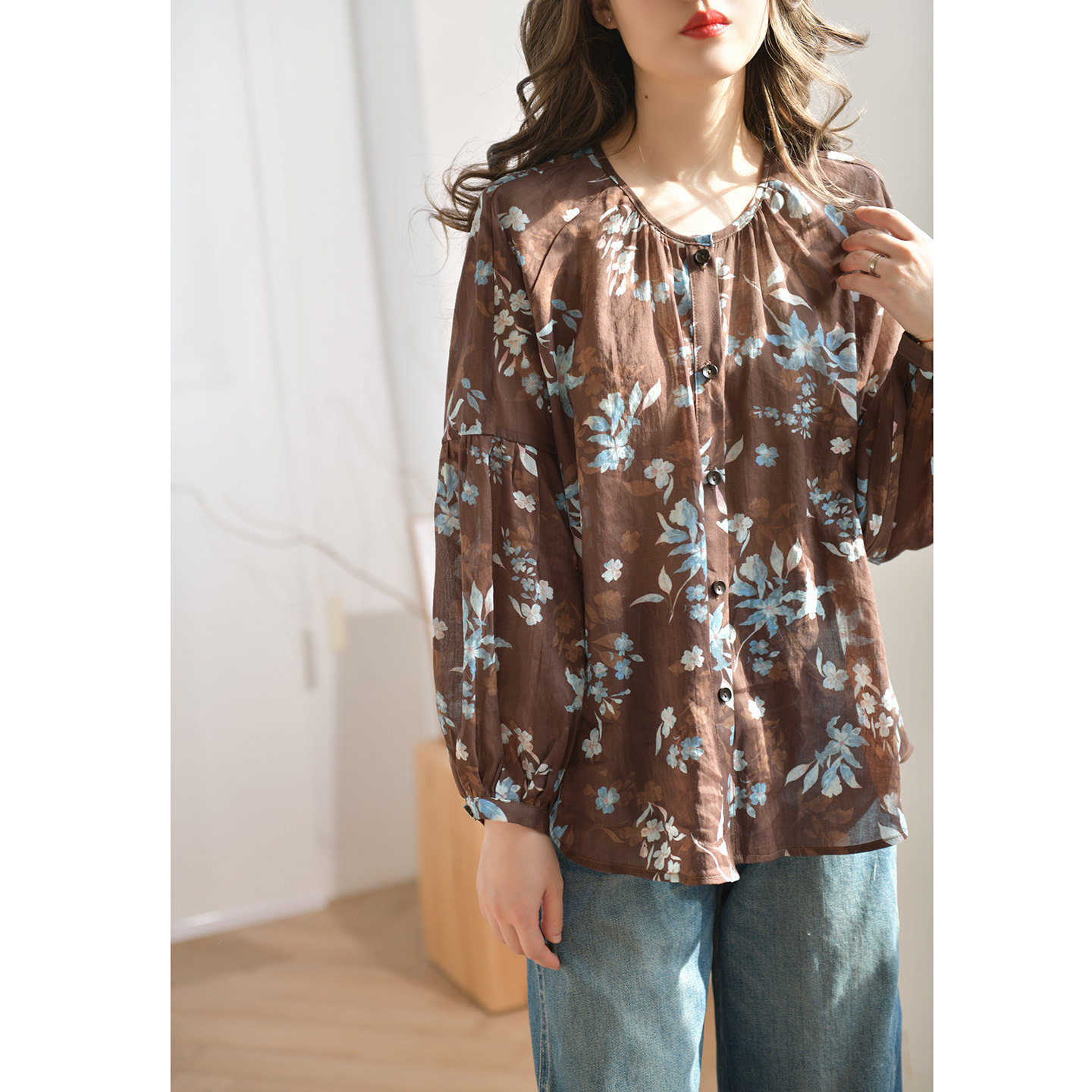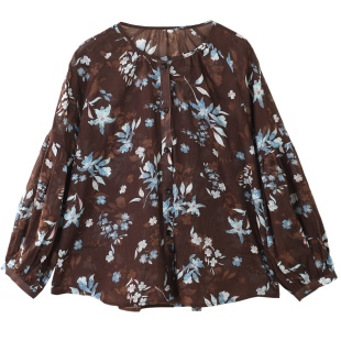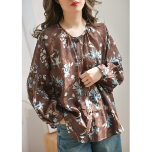上衣26新品 气质碎花衬衣单排扣长袖 女春季 GESGOO宽松圆领棉麻衬衫