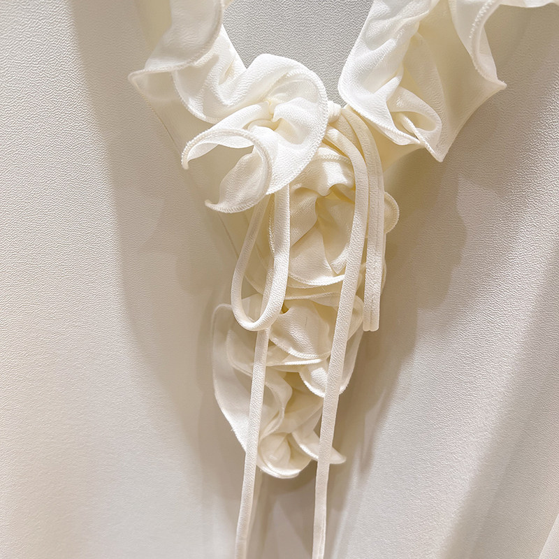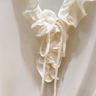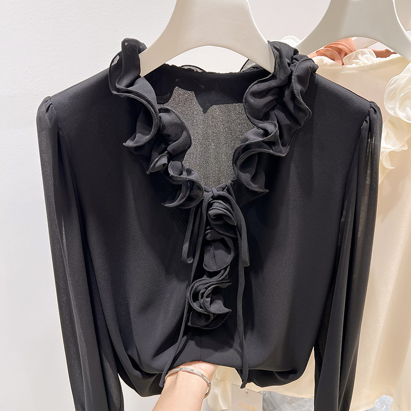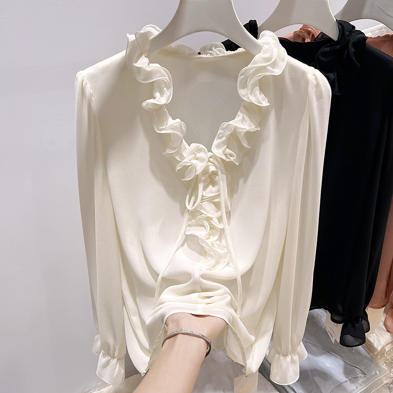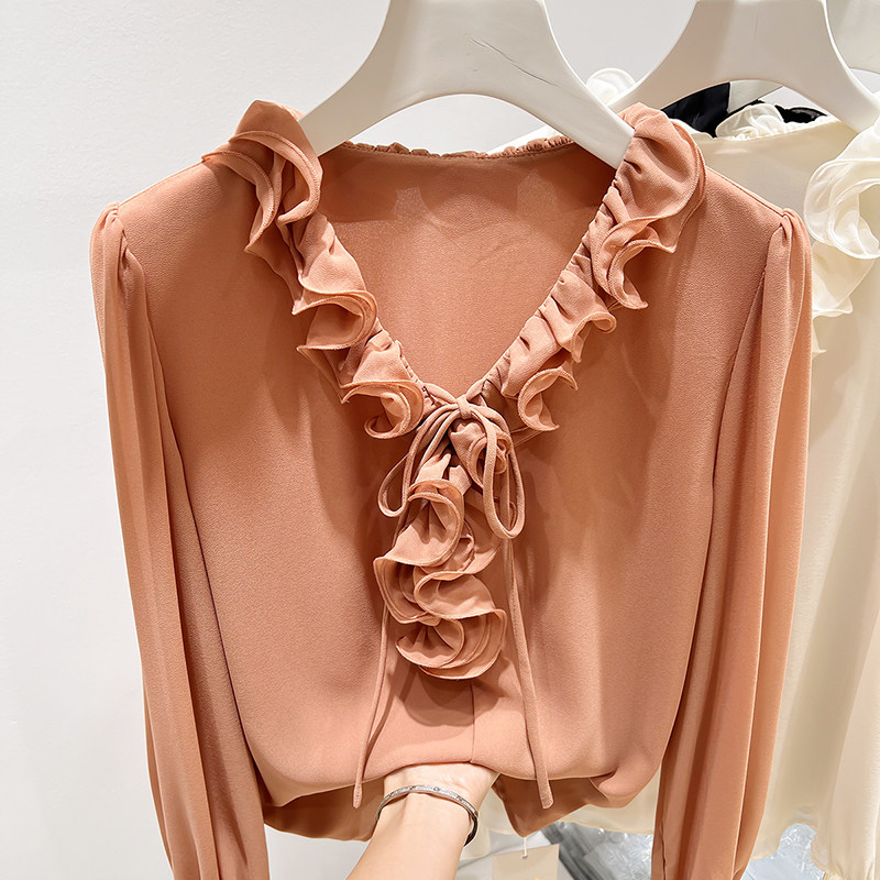 女春季 2026新款 雪纺衫 气质显瘦V领木耳边系带纯色套头长袖 法式