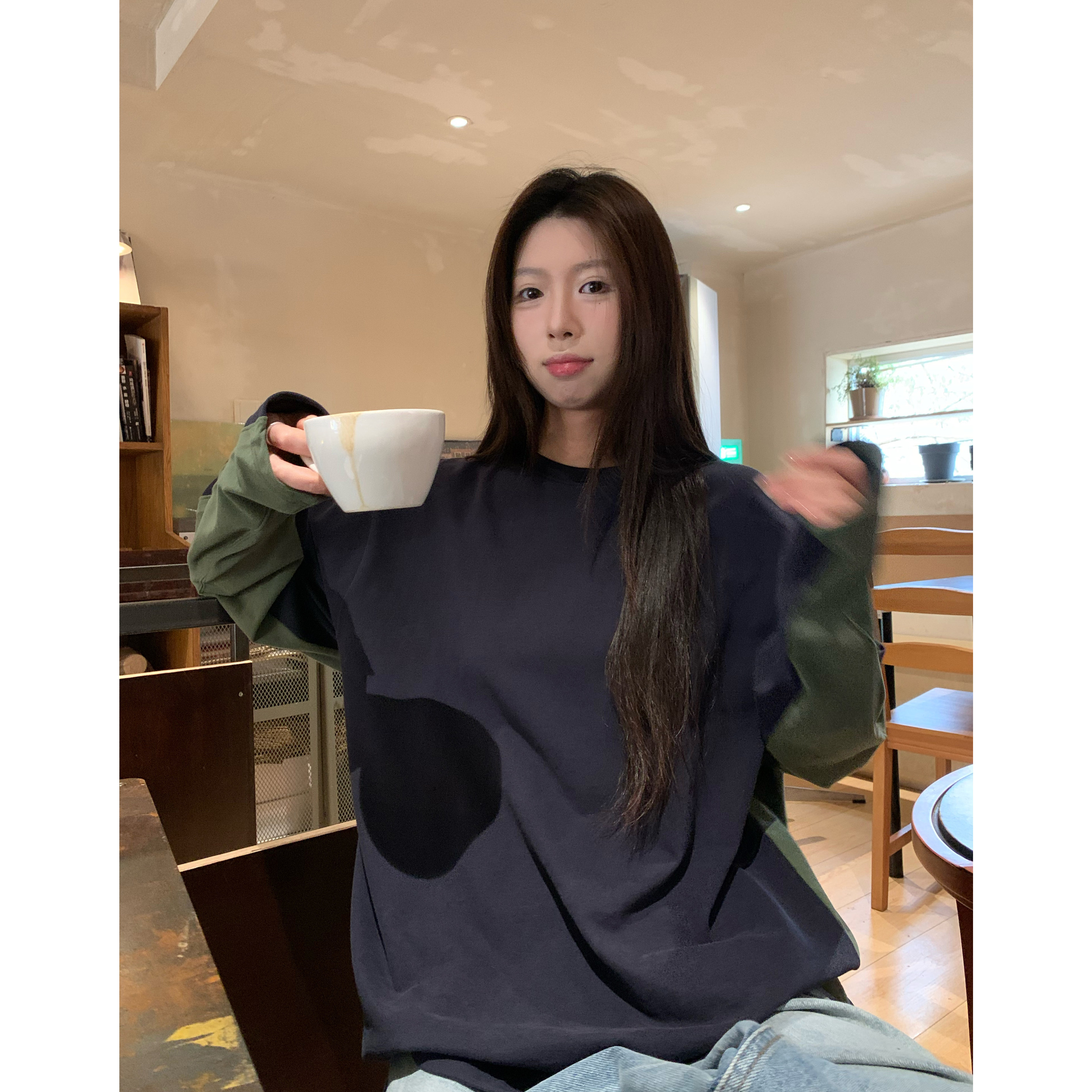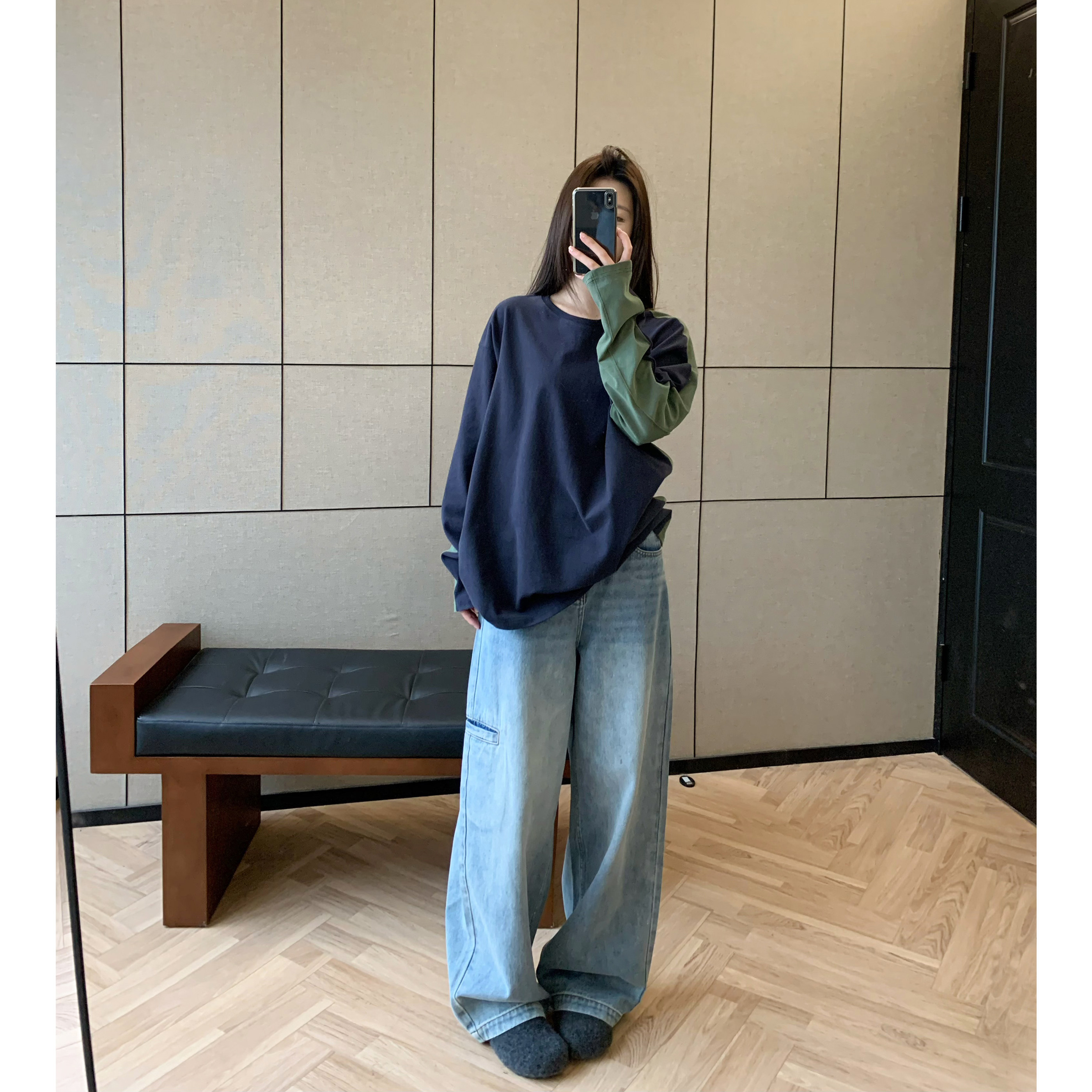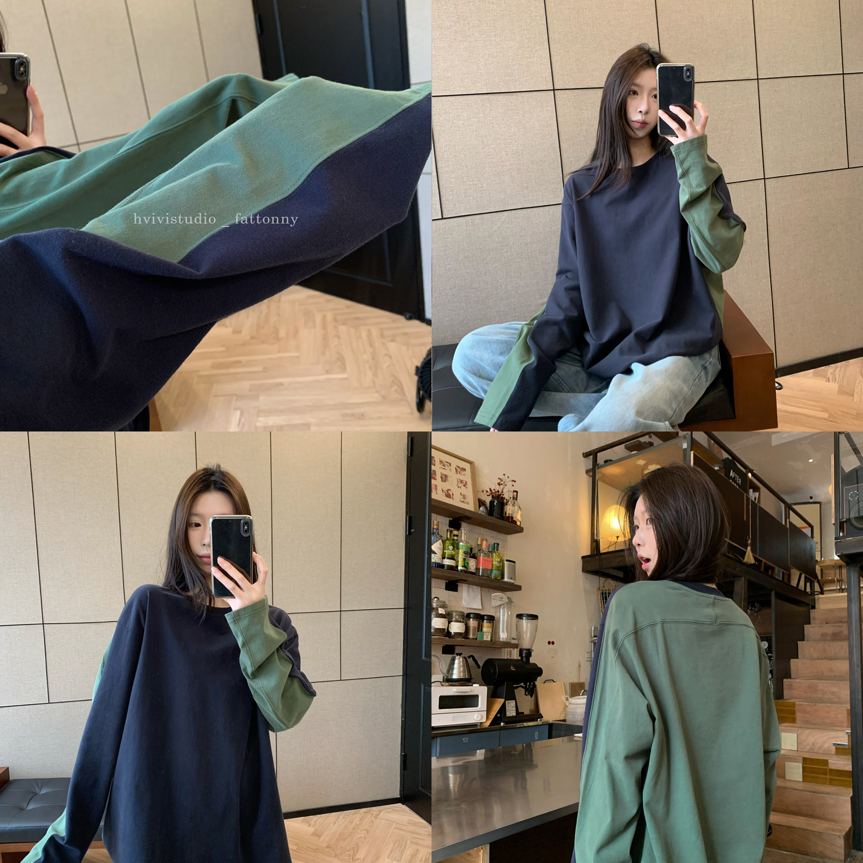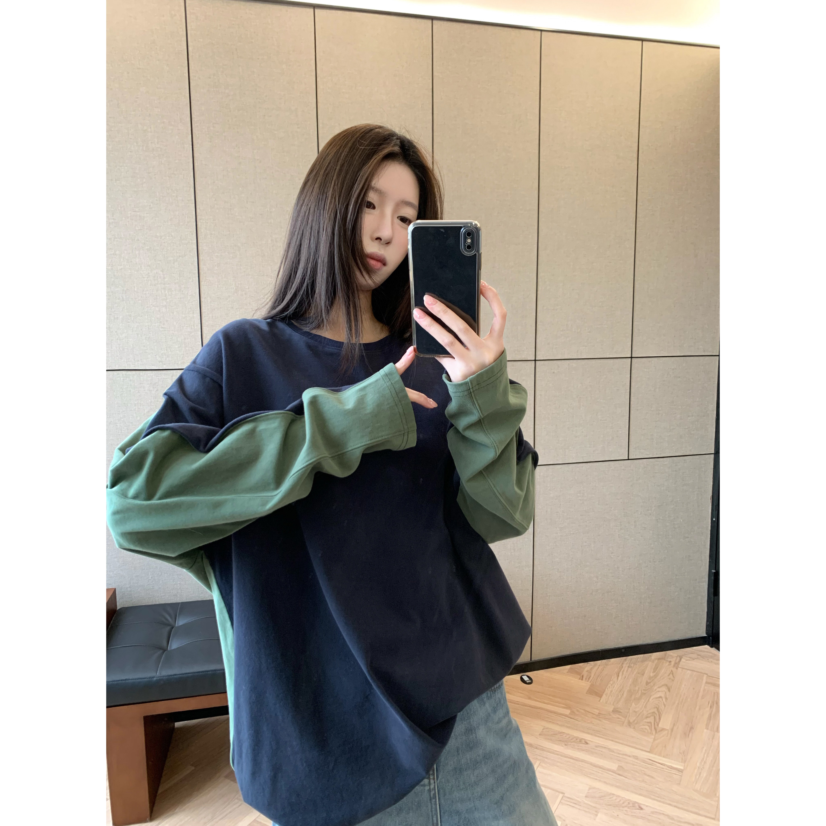 上衣长袖 HVIVI 松弛感100棉套头宽松春季 拼接撞色落肩袖 T恤女 新款