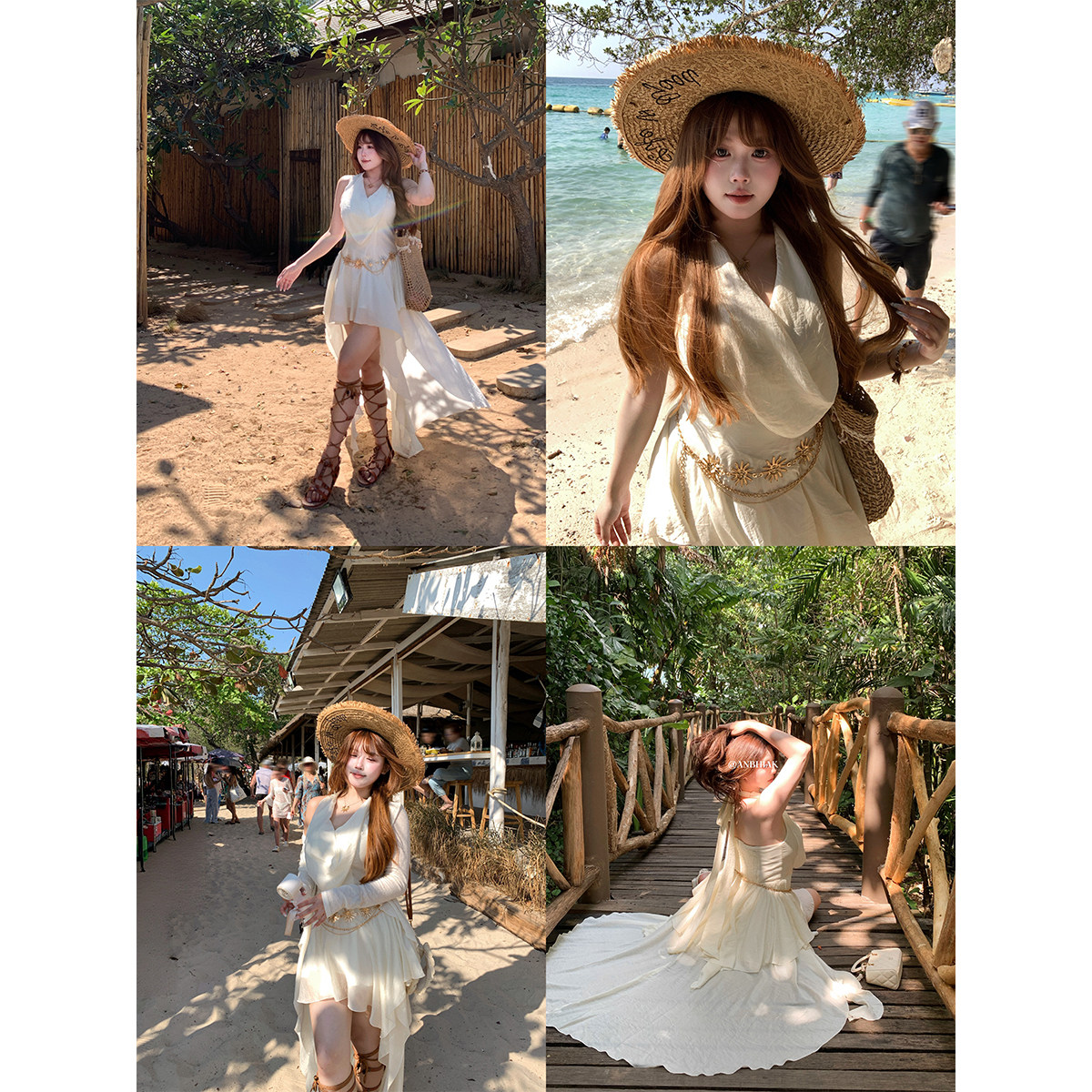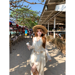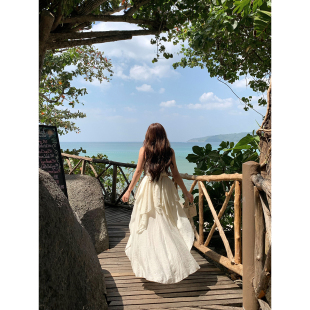 安妮不火 度假风长裙子 波西米亚风不规则荷叶边连衣裙女微胖大码