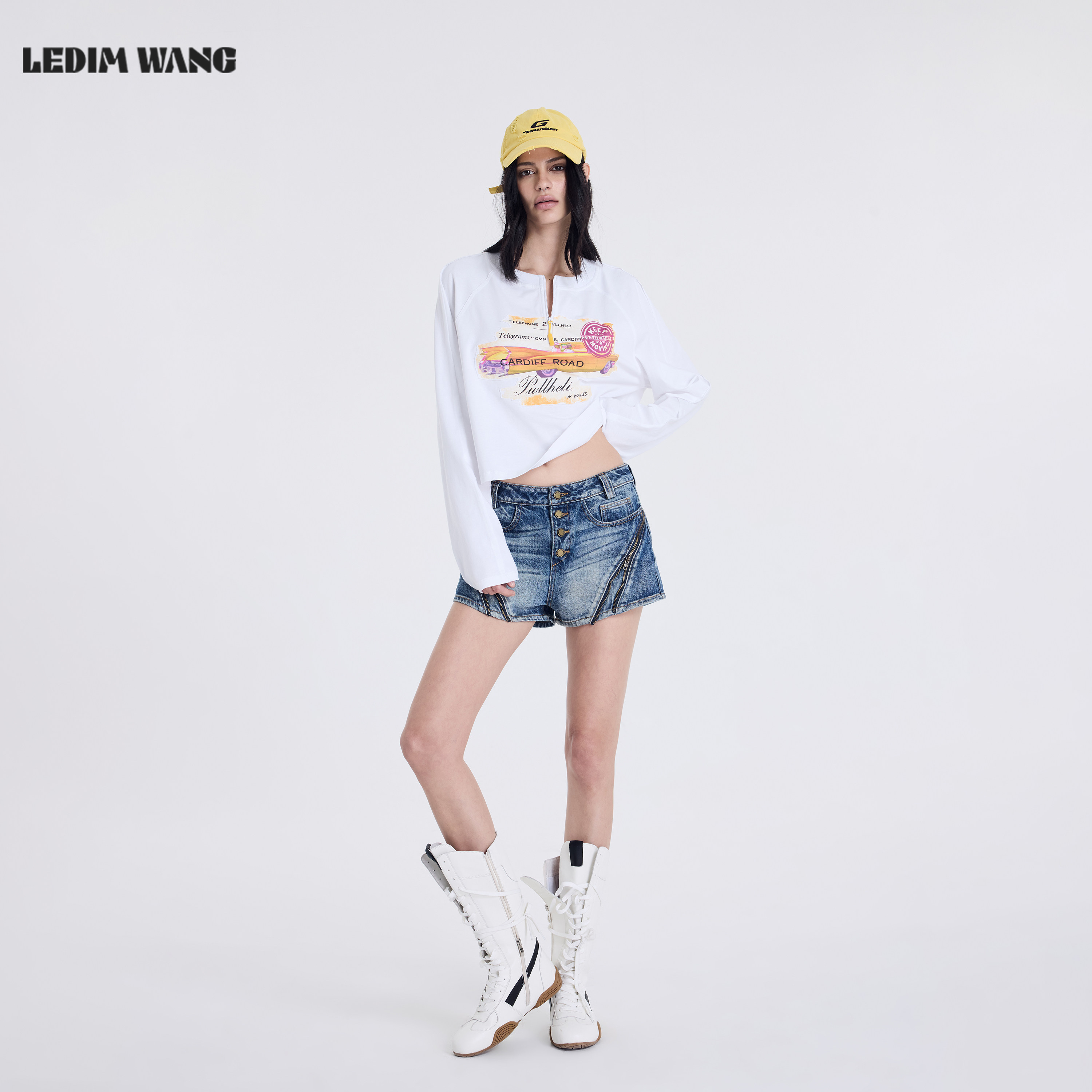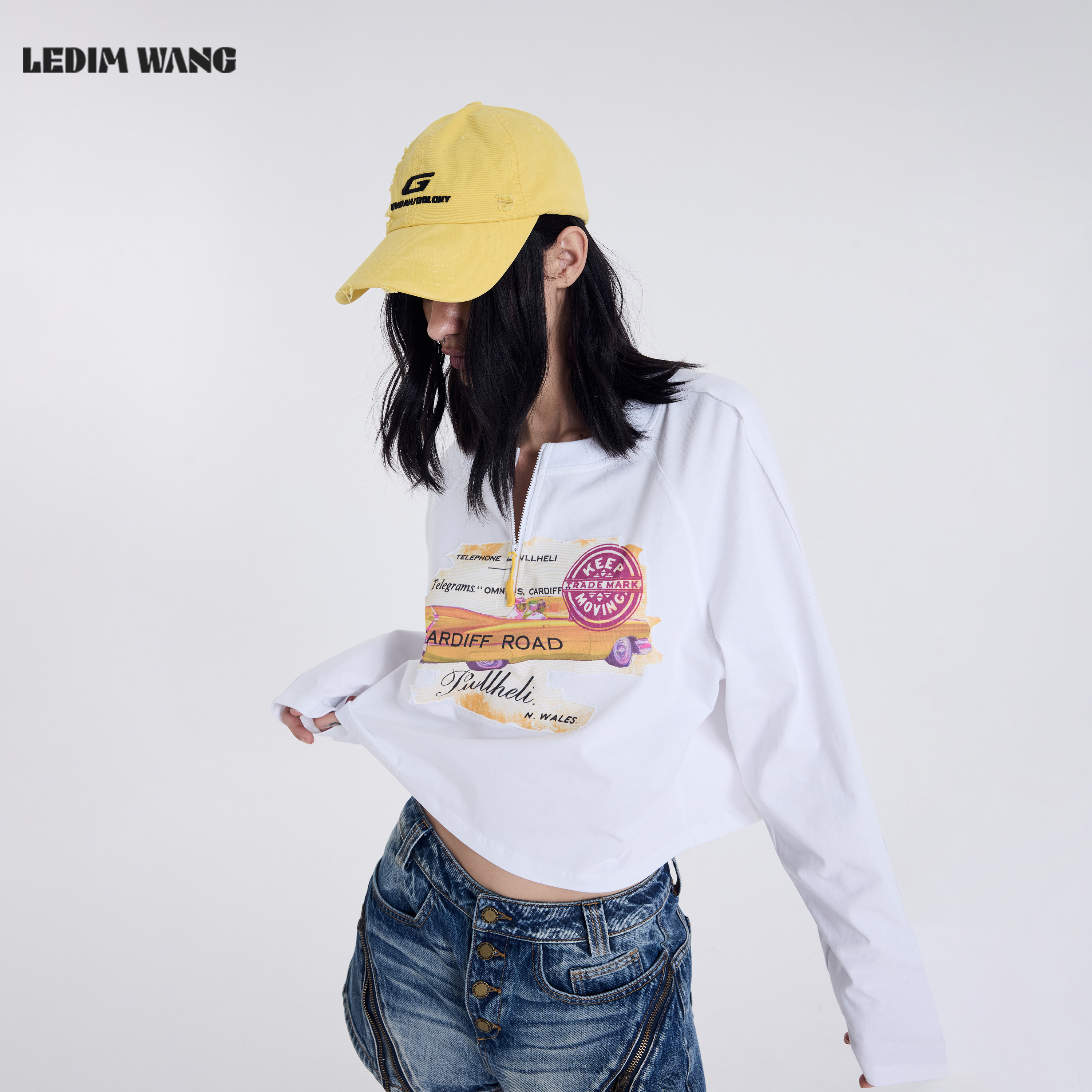 白色百搭长袖 LEDIM T恤女2026春夏新款 长袖 上衣 WANG印花拉链短款