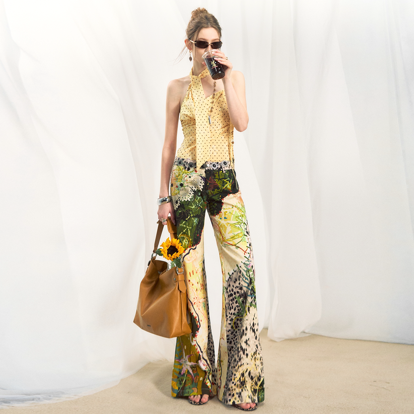 OfAkiva 波点吊带背心女荡领野餐流苏挂坠飘带短上衣 柠檬草