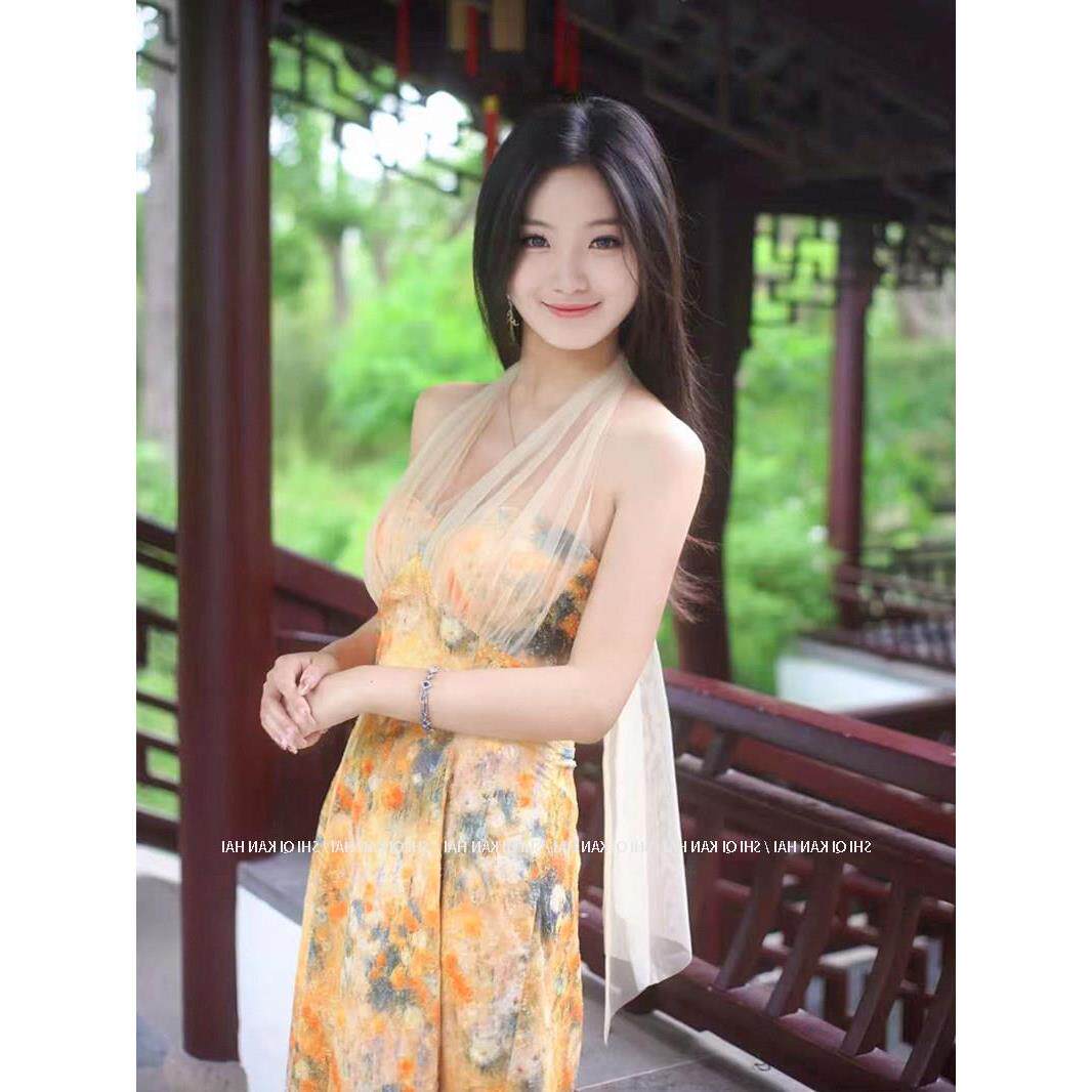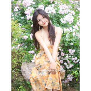 十七看海法式 度假风高级感油画裙海边沙滩裙 印花挂脖连衣裙女夏季