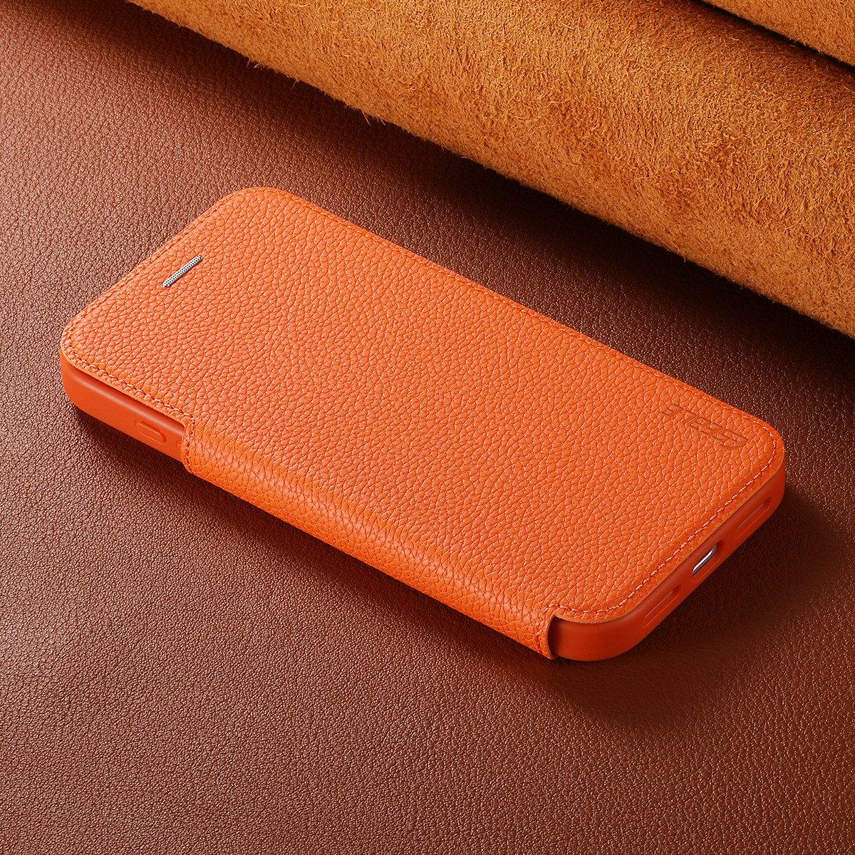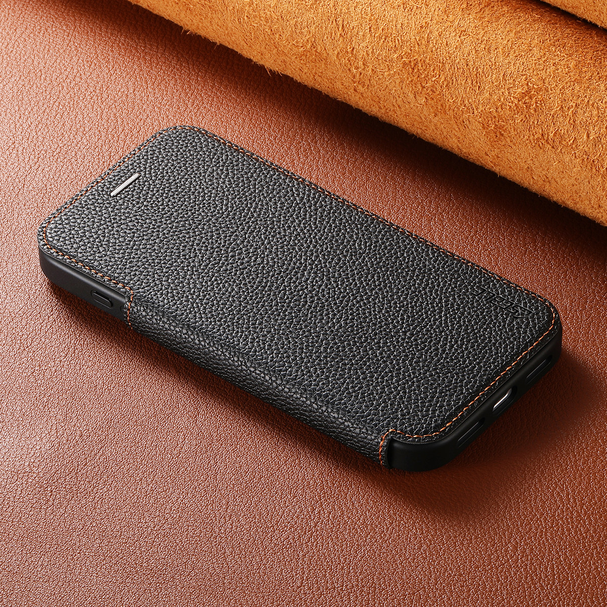 适用苹果14翻盖手机壳荔枝纹皮革iPhone15ProMax掀盖保护套磁吸充电16钱包17E薄13卡夹防摔蓝橙黑色Flip Case