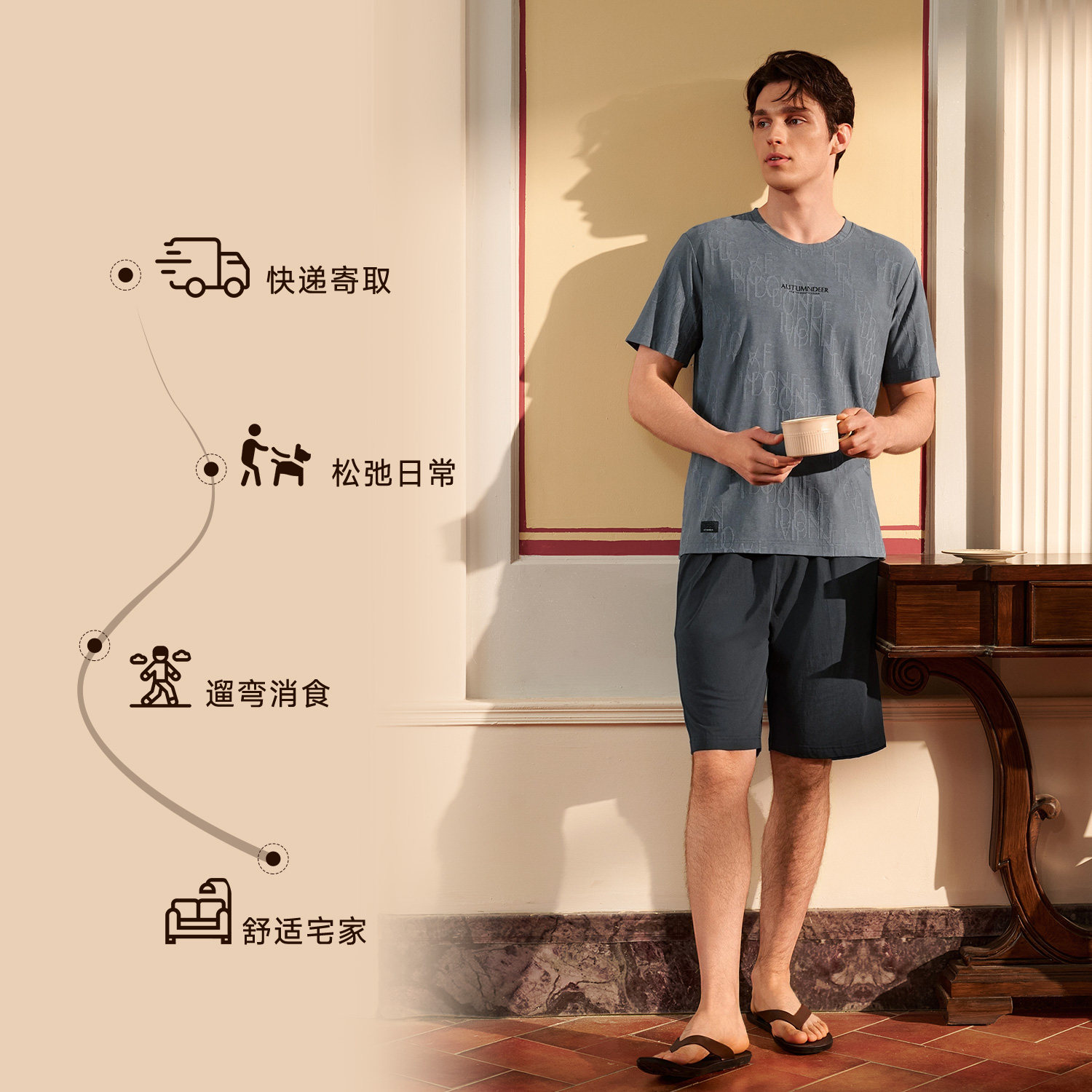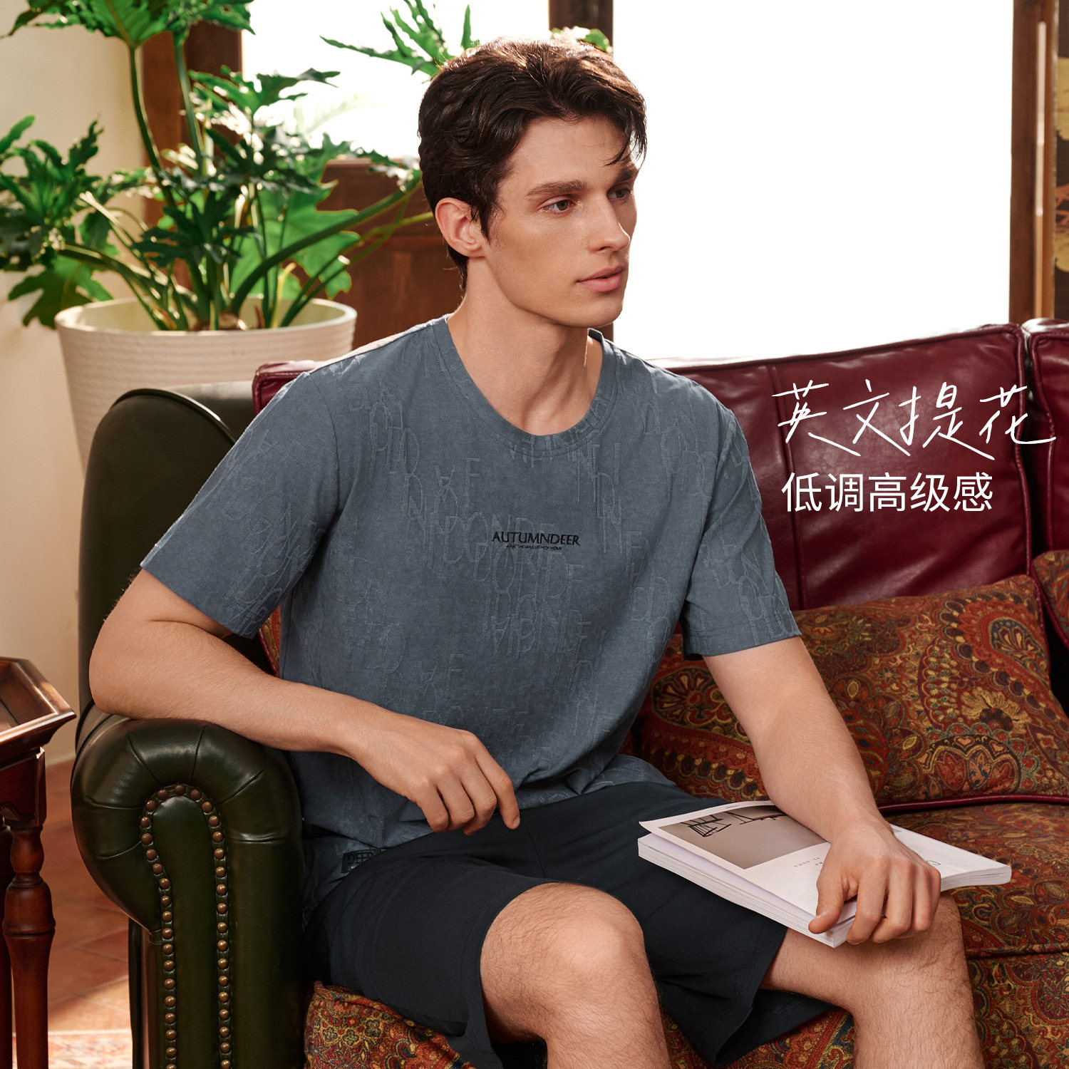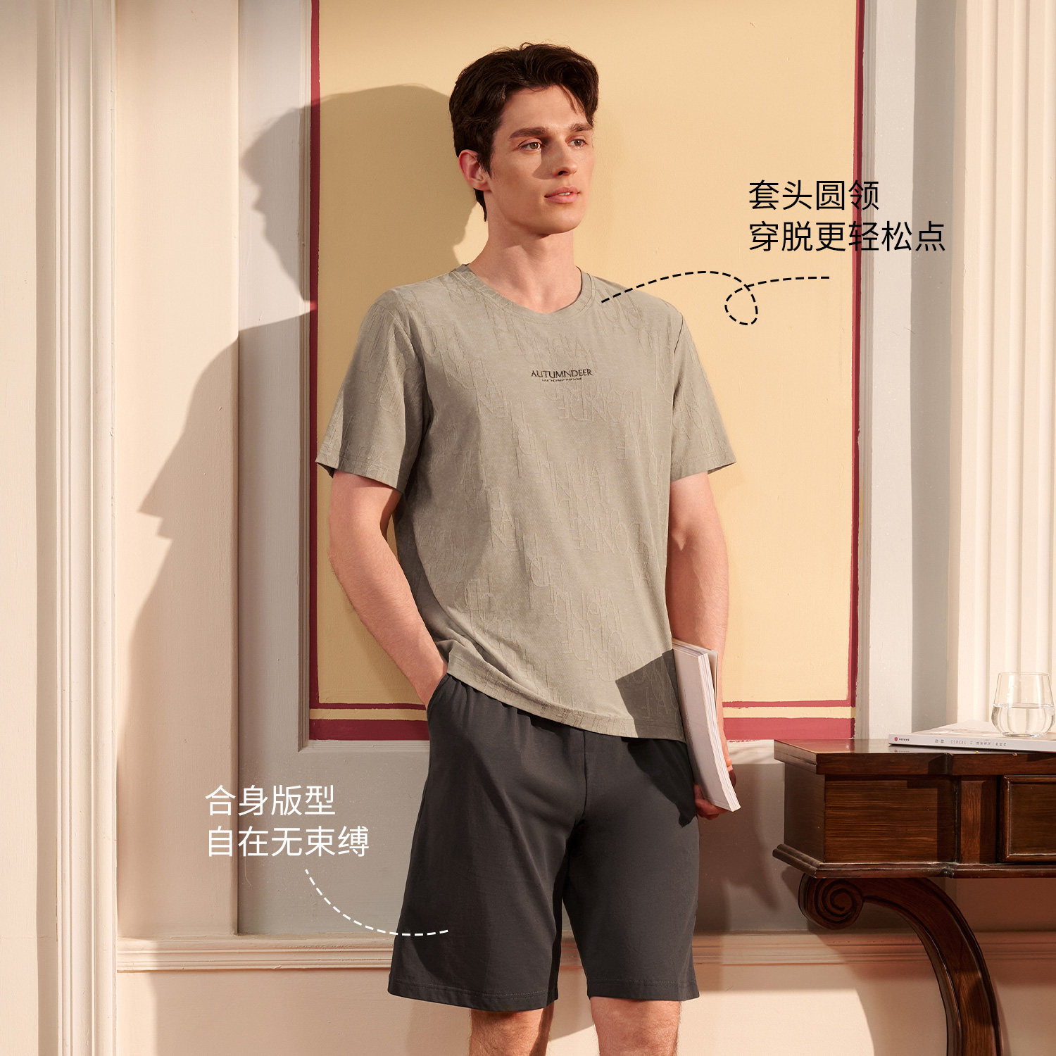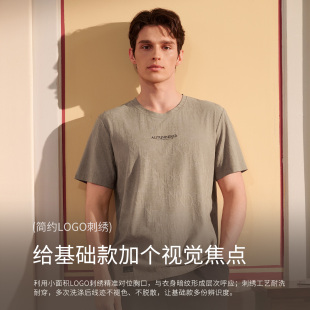 春夏季 秋鹿睡衣男士 2026新款 短裤 简单家居服 套头圆领英文刺绣短袖