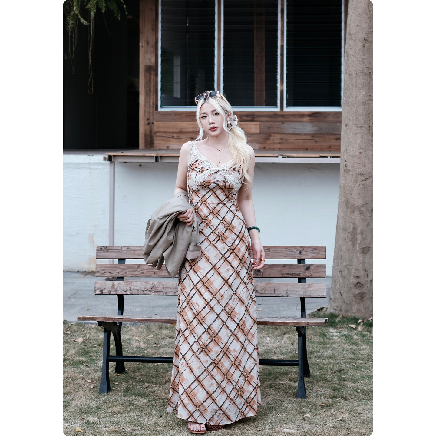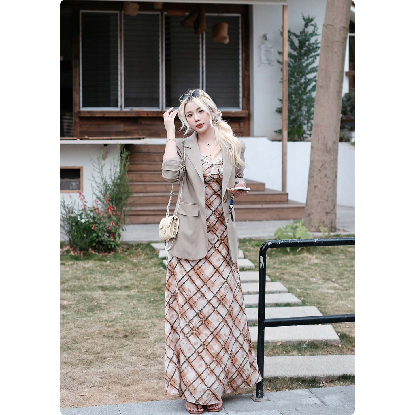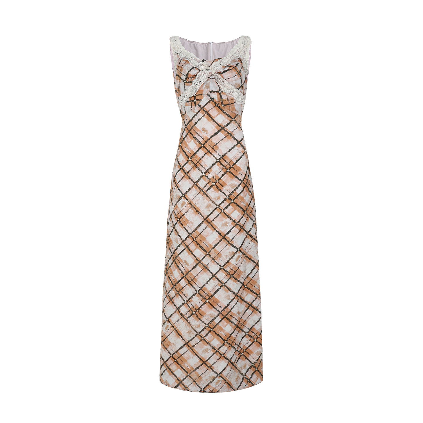 显瘦A字大长裙背心裙 格纹吊带连衣裙女法式 糯米子 落日经纬