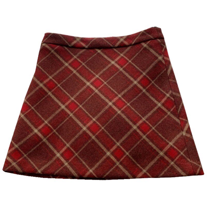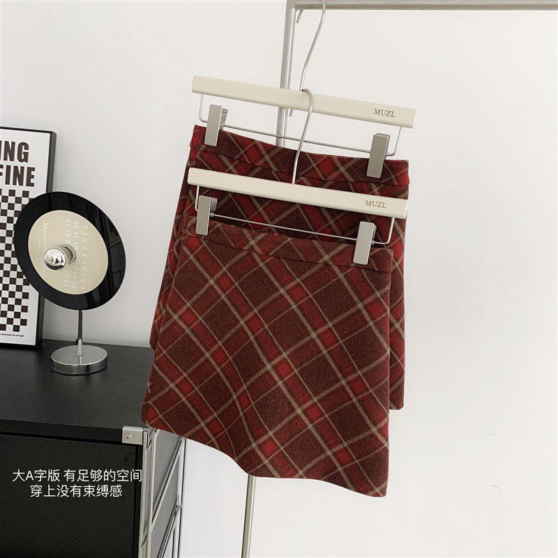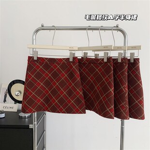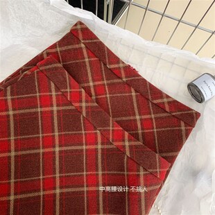 复古红色格纹半身裙女胖mm小个子裙裤 毛呢a字裙半裙格子包臀短裙