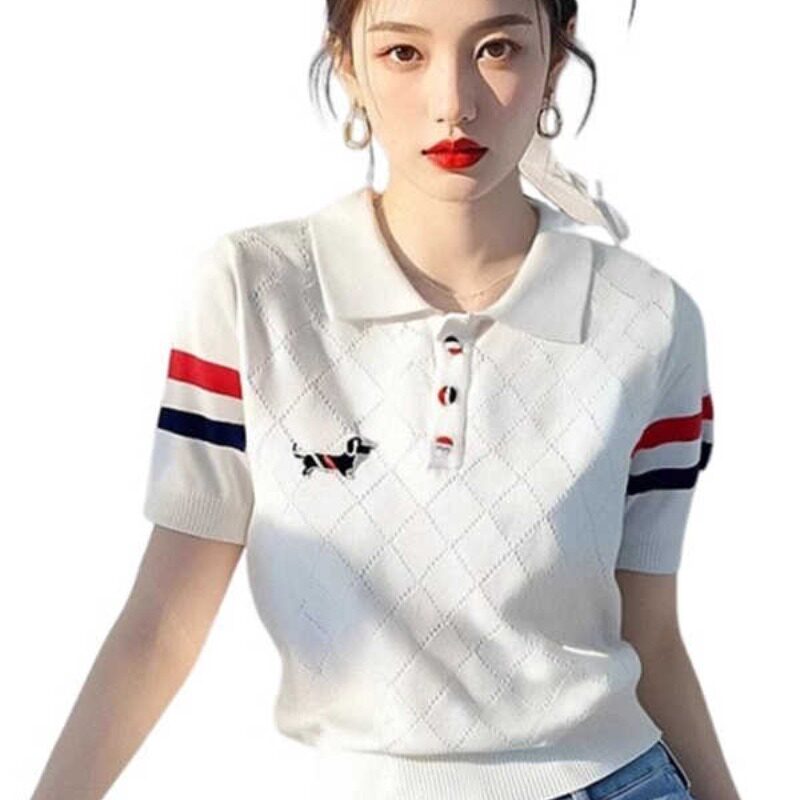 女白色菱格纹T恤女短款 2026夏季 冰丝针织衫 polo领短袖 上衣 新款
