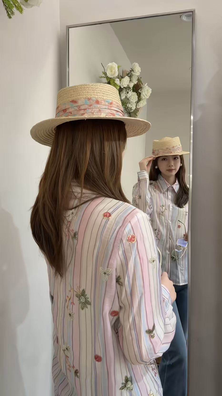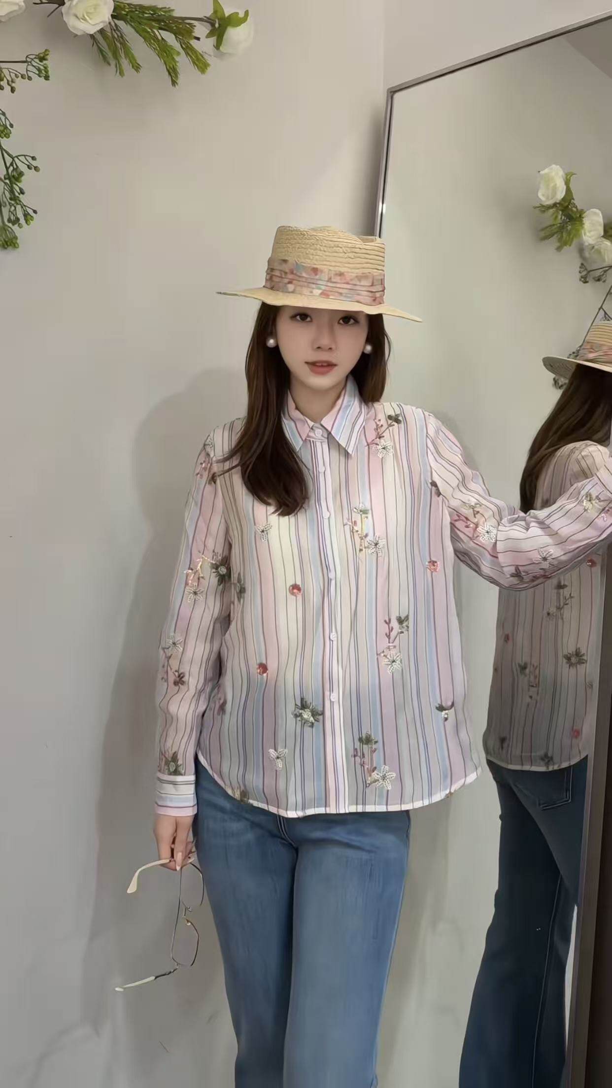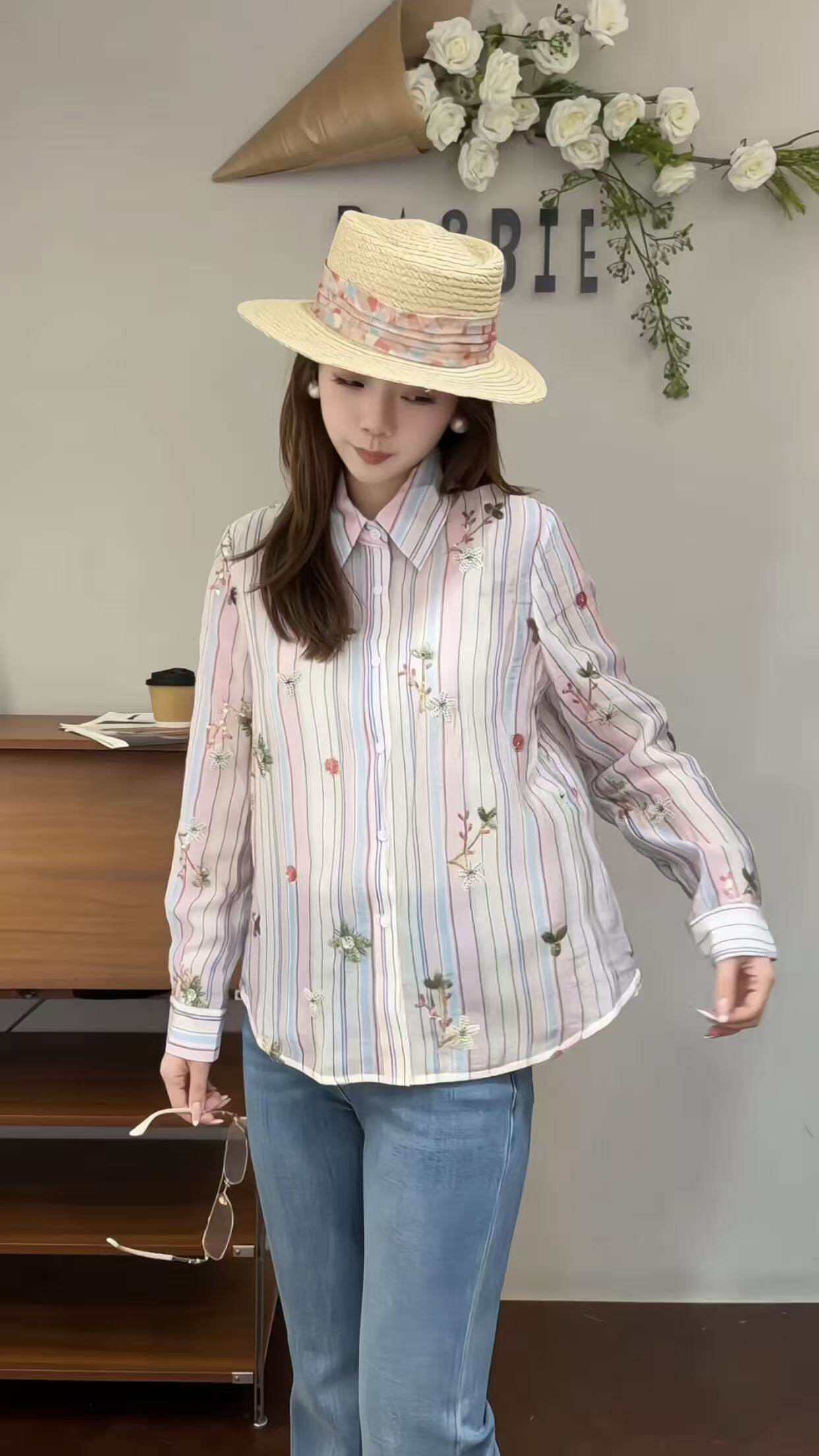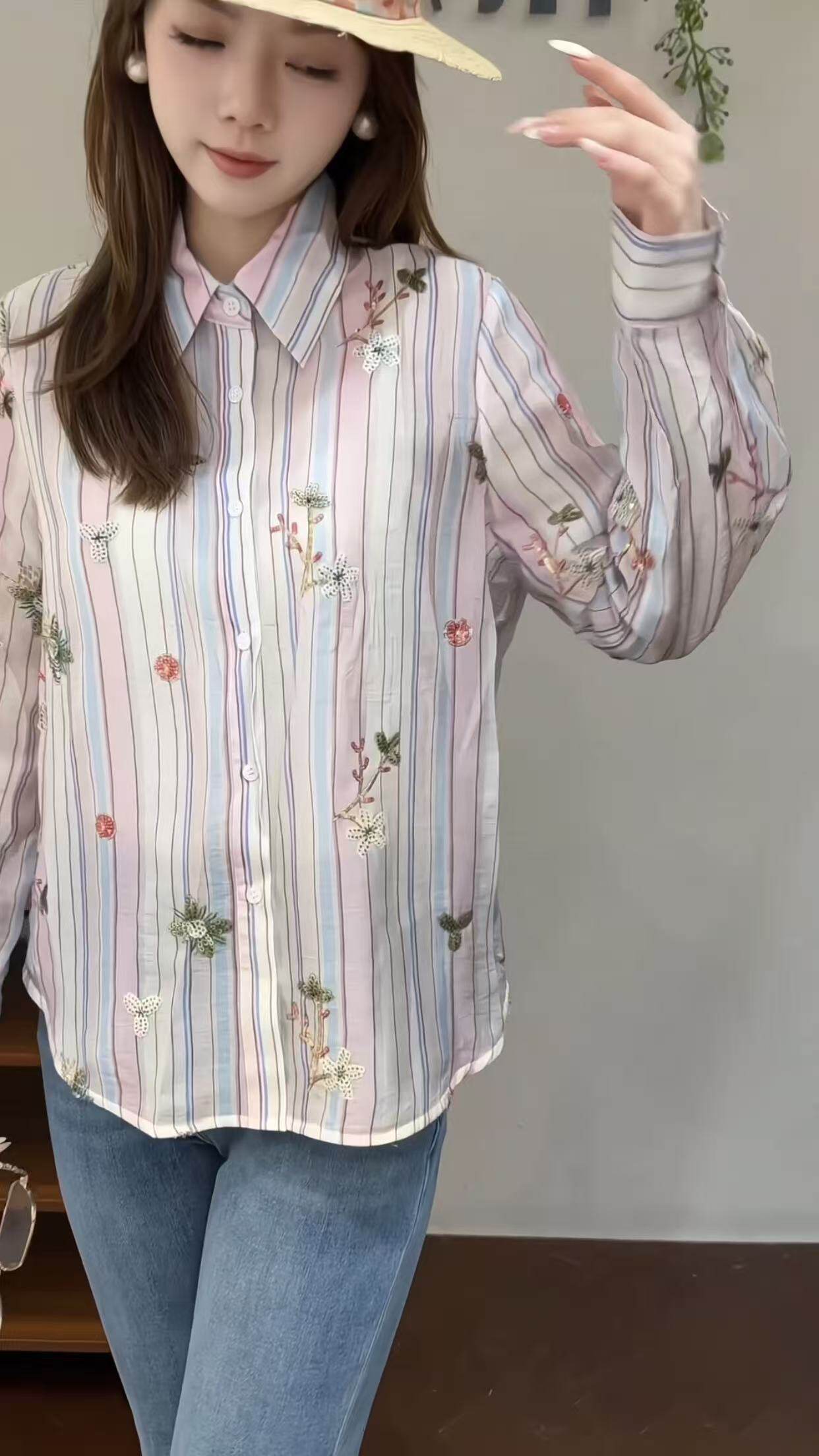 欧洲站2026新款 81052 欧货韩系小清新春意绣花翻领条纹减龄女衬衫